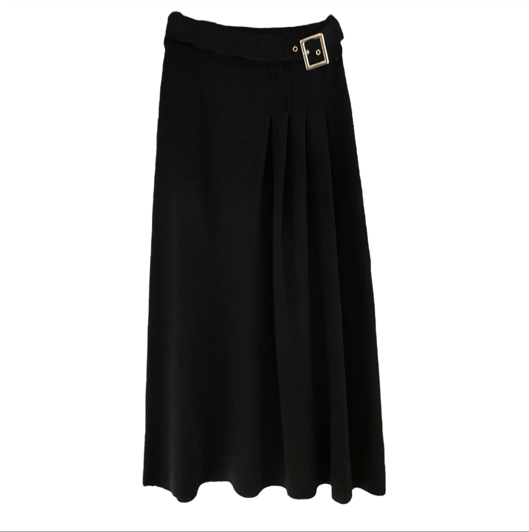 Gonna donna longuette in maglina. Vita con elastico e fibbia sul davanti effetto cintura. Pences laterali effetto plissettato laterale, lunghezza alla caviglia. Vestibilità comoda. Composizione tessuto 68% viscosa 32% poliestere.