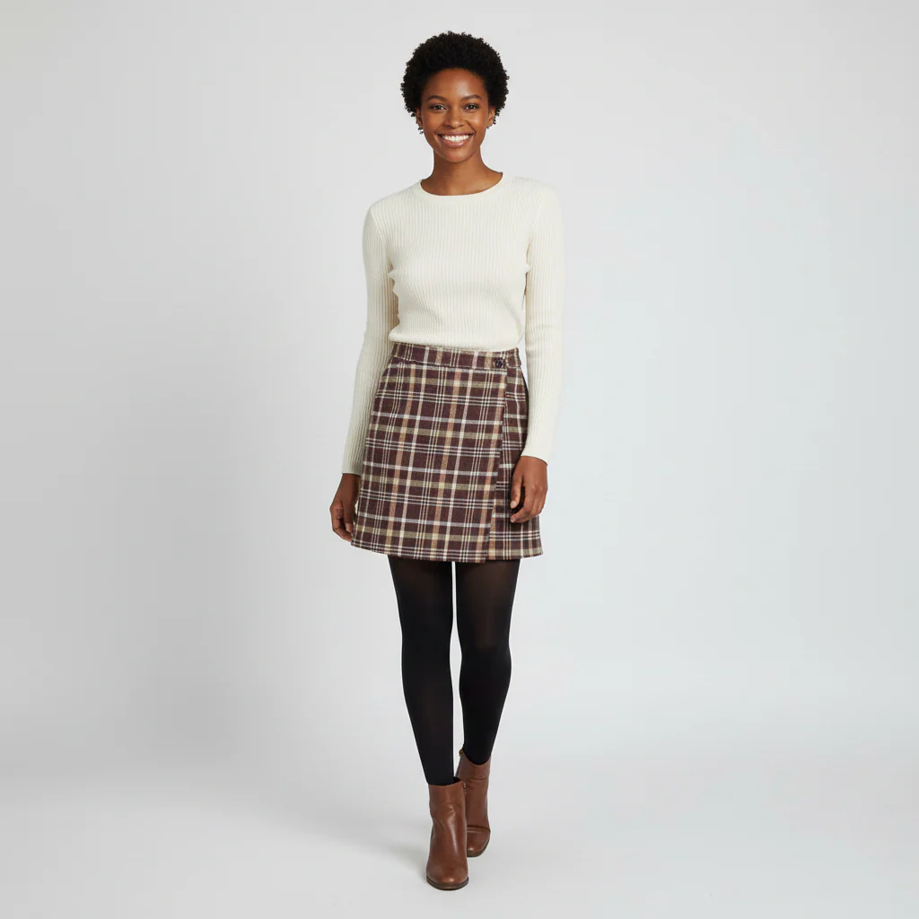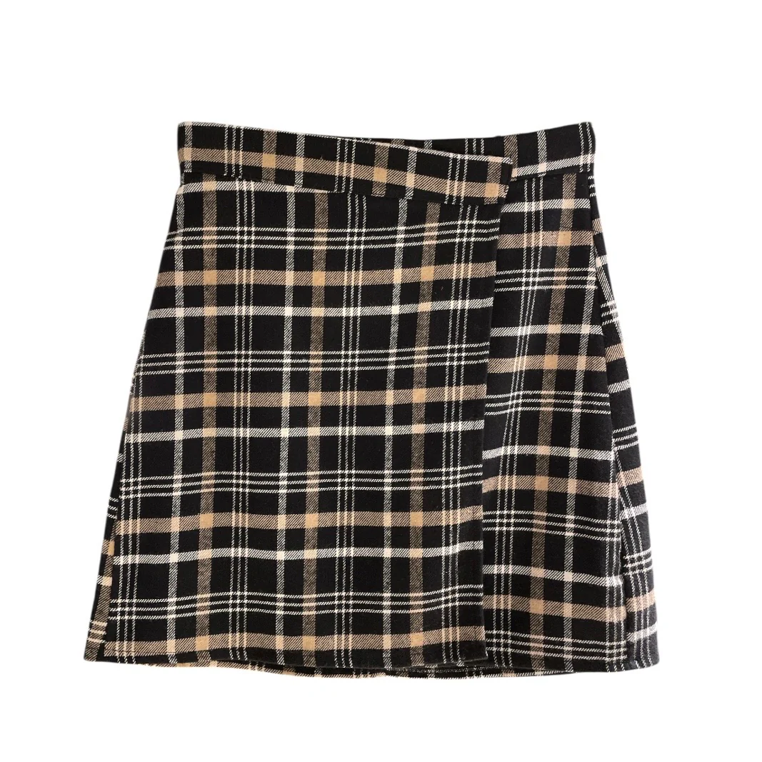 Mini gonna in tessuto mano lana fantasia quadretti. Cinturino fisso con chiusura con zip invisibile. Apertura laterale stile portafoglio. Lunghezza a metà gamba, vestibilità slim. Composizione tessuto 75% cotone 25% poliestere 5% viscosa.