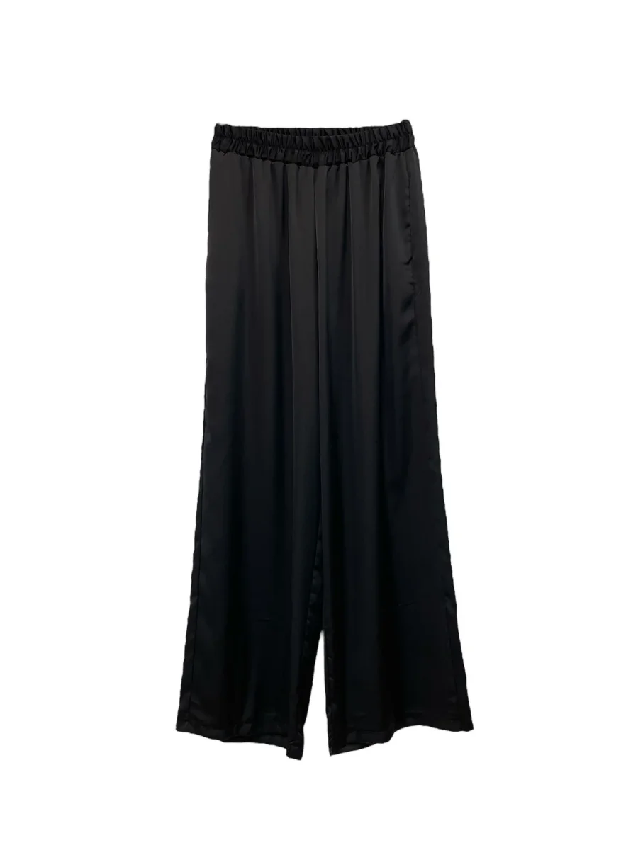 Pantaloni modello palazzo in tessuto raso lucido. Vita alta con elastico, gamba e fondo ampi. Vestibilità regolare. Composizione tessuto 100% poliestere. Crea il completo con la casacca abbinata.