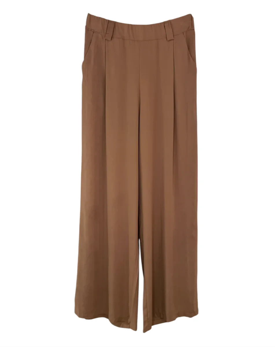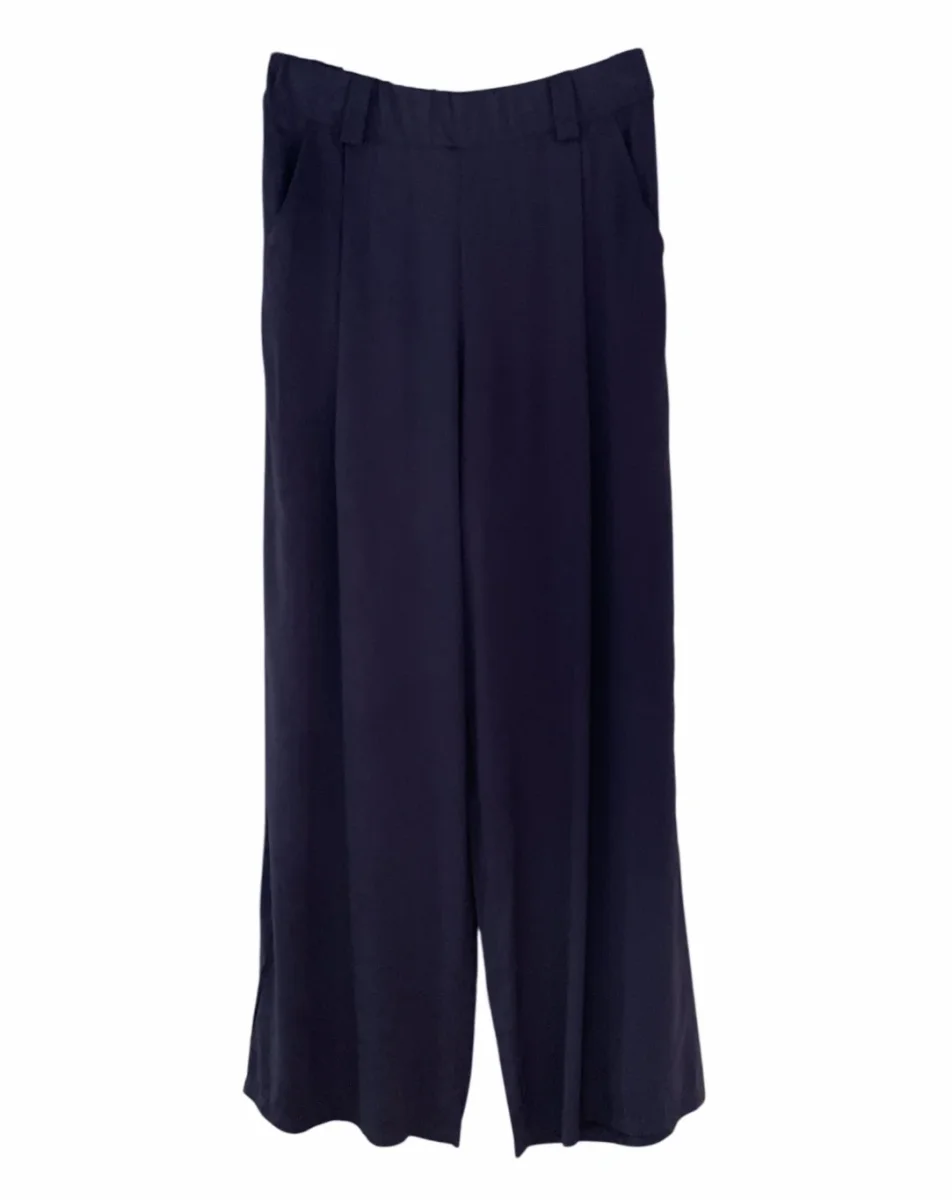 Pantalone basic in tessuto leggero 100% viscosa. Vita regolare con cinturino fisso con passanti sul davanti ed elastico sulla schiena. Gamba e fondo palazzo. Vestibilità comoda.
