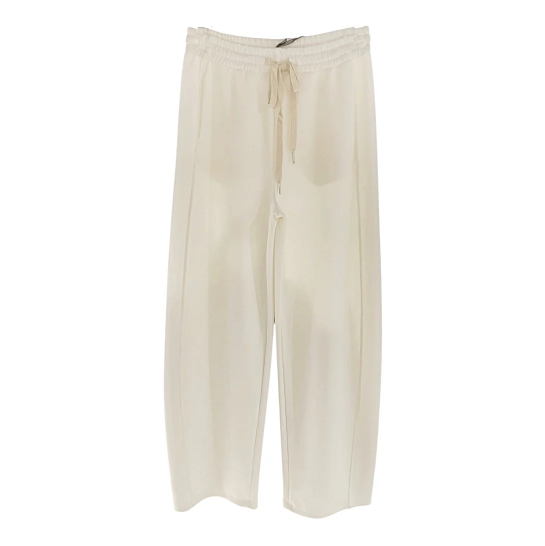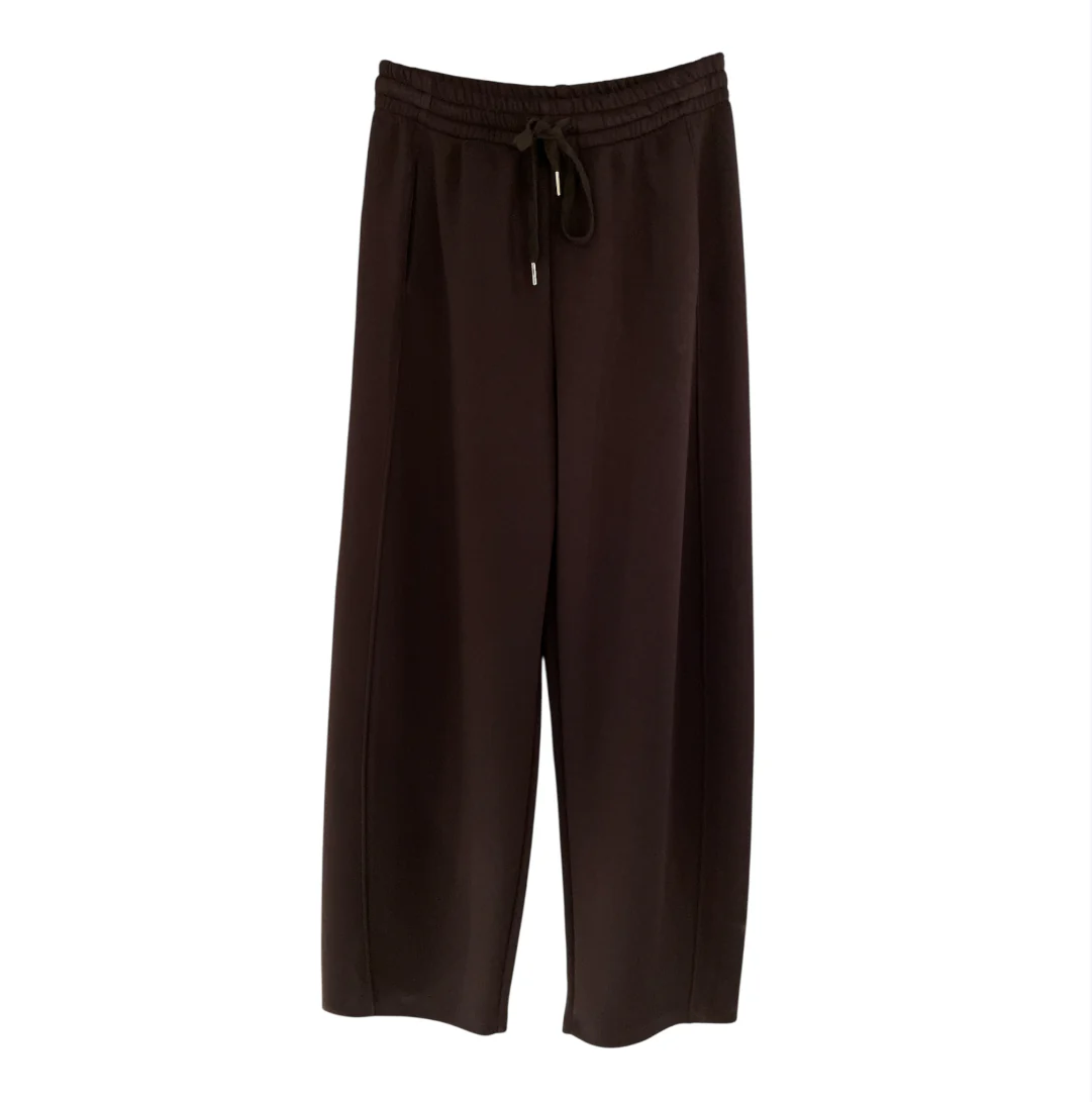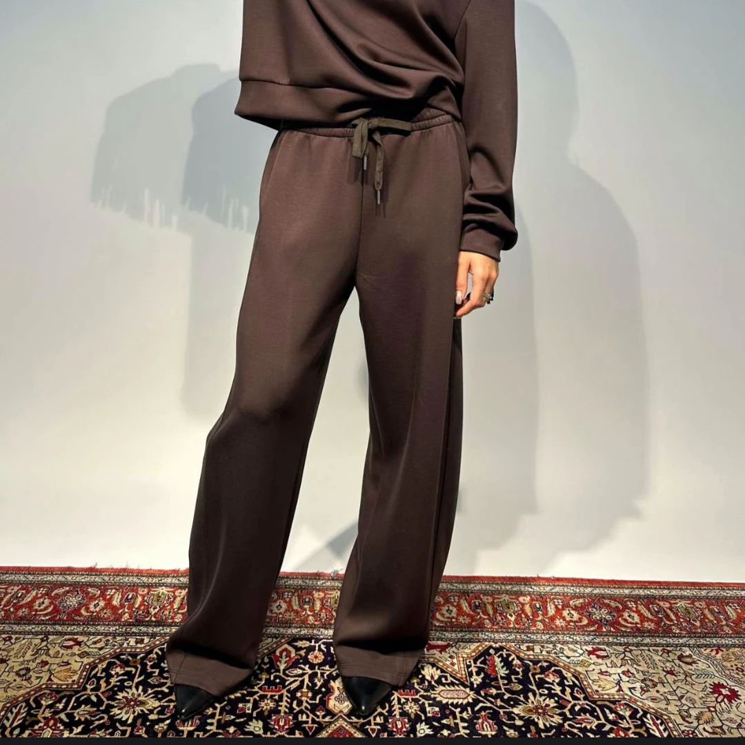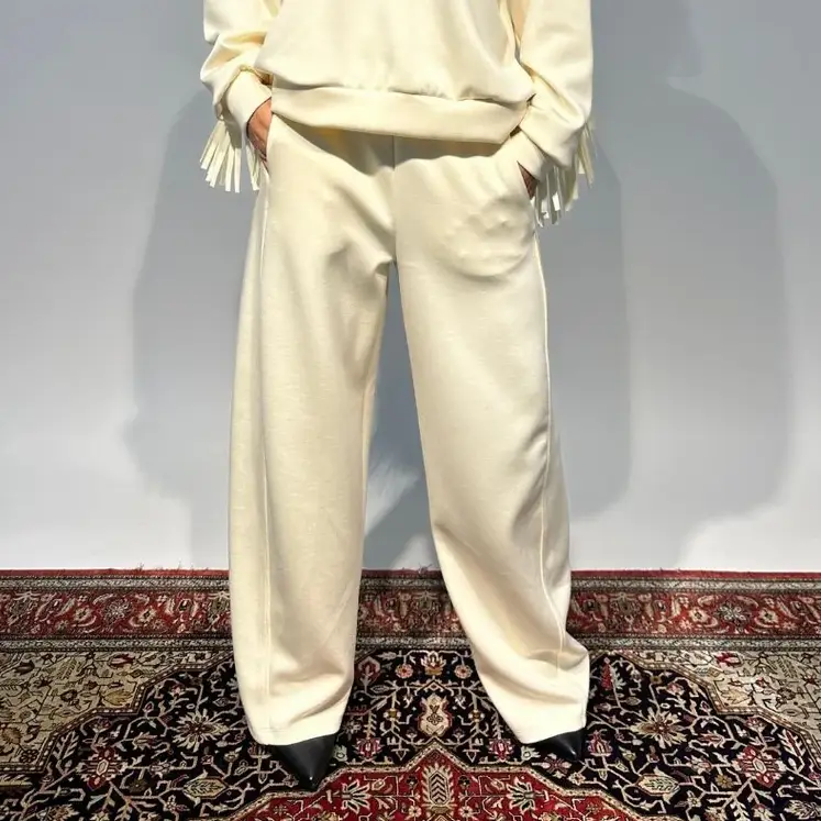Pantalone donna modello tuta in tessuto soft touch misto viscosa. Vita con elastico e coulisse cordino in tinta, tasche laterali. Gamba e fondo ampi. Vestibilità comoda. Abbina la felpa con le frange. Composizione tessuto 50% poliestere, 45% viscosa, 5% elastan.