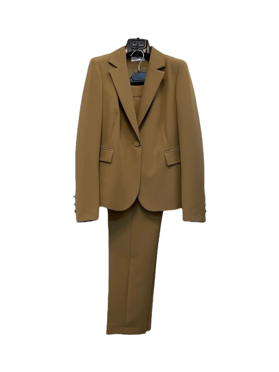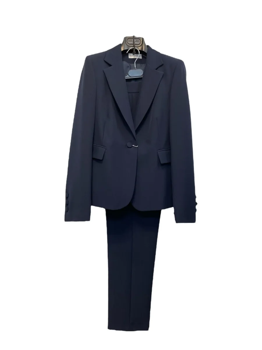 Tailleur in tessuto tecnico elasticizzato. Giacca foderata, abbottonatura con bottone centrale rivestito in tessuto tono su tono, collo con revers regolari, tasche laterali con pattina. Maniche lunghe con bottoni rivestiti in tessuto. Pantalone vita regolare, cinturino fisso, chiusura con zip e bottone. Gamba e fondo stretti, piega con spacchetto. Vestibilità regolare.