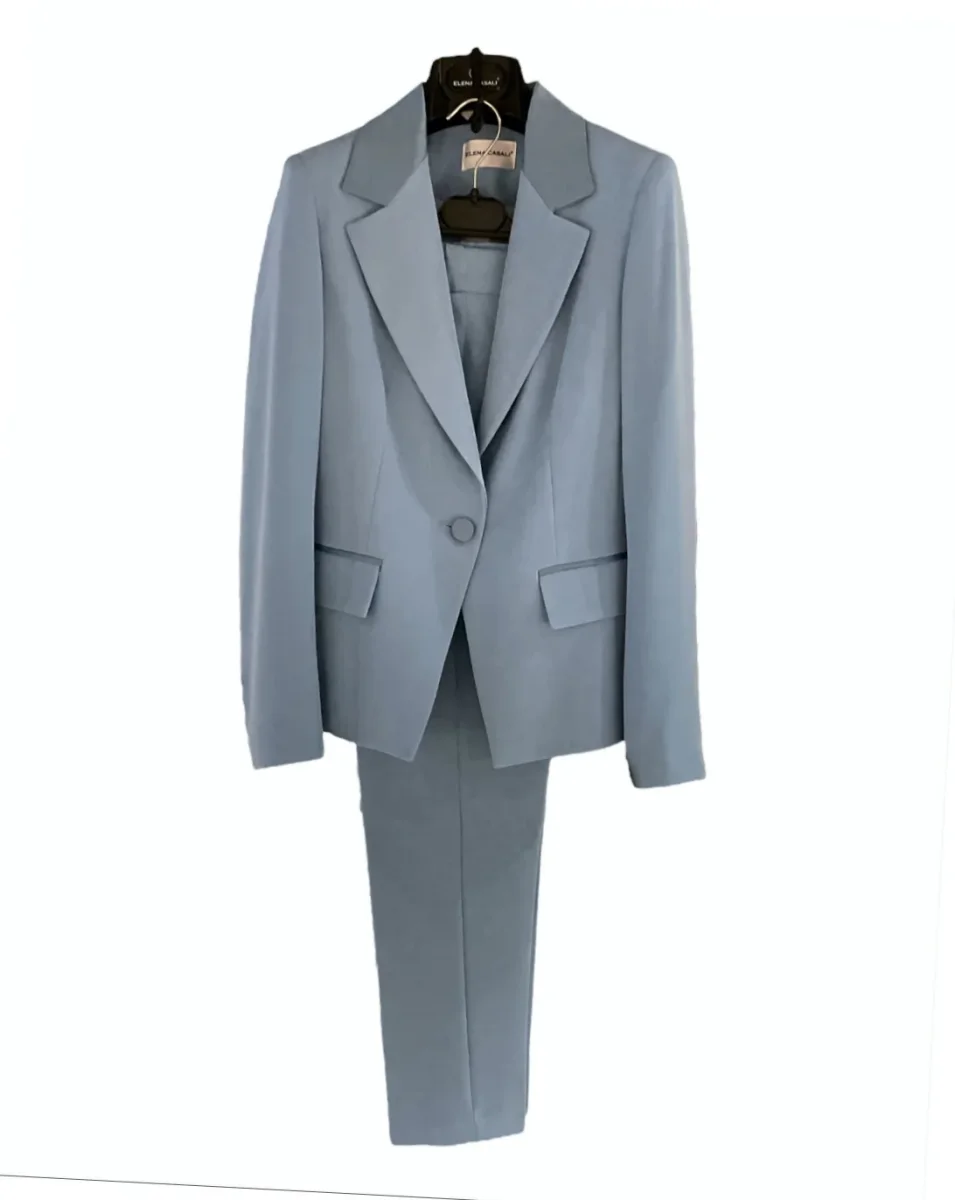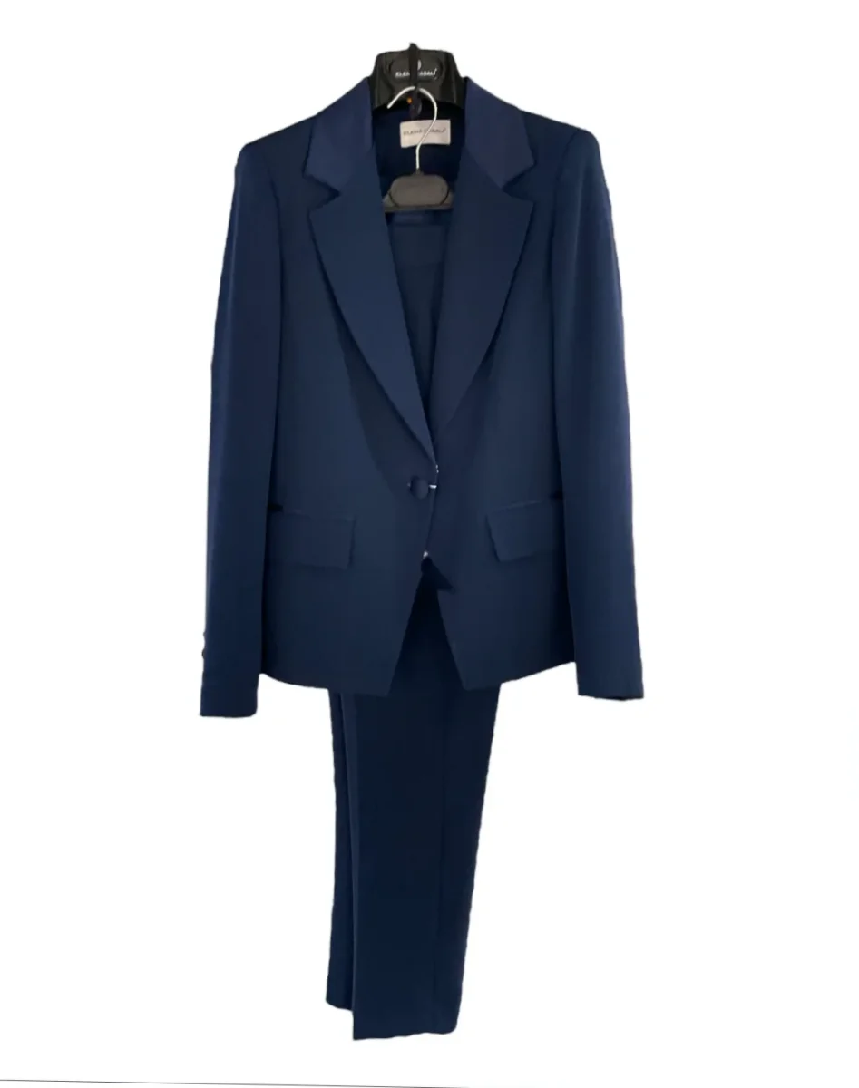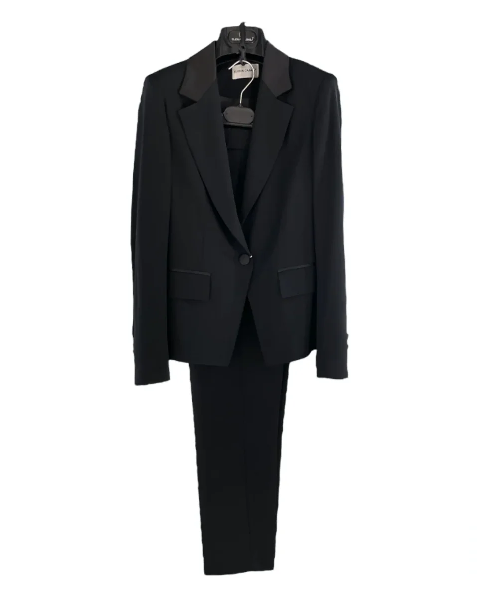 Tailleur modello smoking in tessuto tecnico leggero. Collo sciallato in tessuto lucido rasato, bottone in tinta rivestito in raso. Pantalone vita regolare, chiusura con zip e bottone, elastico nella parte posteriore. Gamba slim e fondo stretto. Vestibilità regolare. Composizione tessuto 89% poliestere 11% elastan.