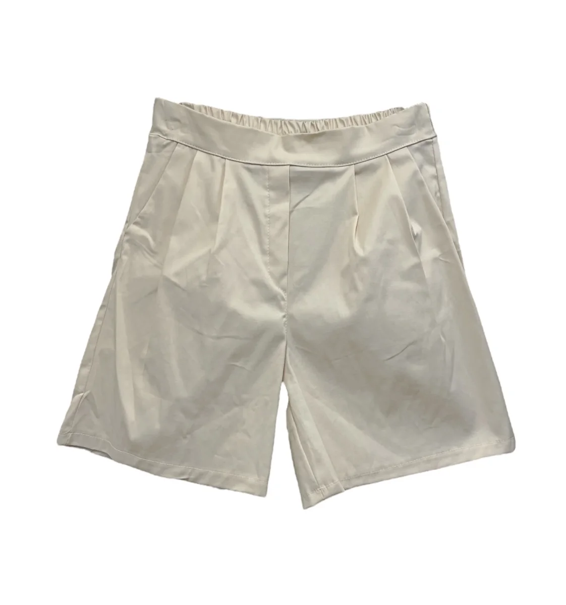 Short in tessuto cotone leggero. Vita alta con fascia fissa sul davanti con pences, elastico sulla schiena. Tasche a filo laterali. Gamba morbida, lunghezza a metà gamba. Composizione tessuto 100% cotone.