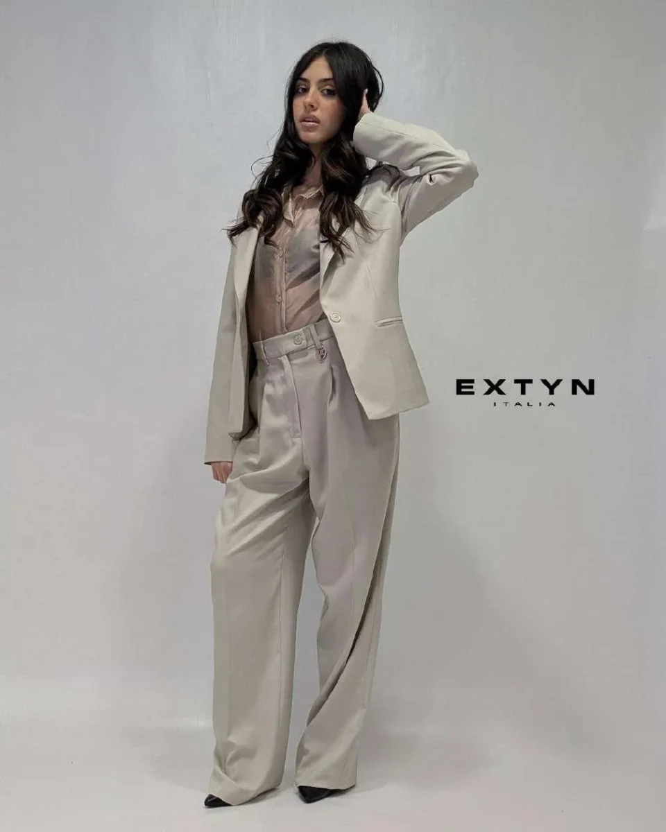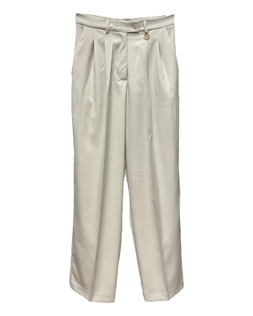 Pantalone donna vita alta in tessuto tecnico. Vita alta con cinturino fisso, chiusura con zip e bottone, tasche laterali a filo e pences. Gamba palazzo e fondo ampio. Vestibilità regolare. Crea il tailleur con la giacca abbinata. Composizione tessuto