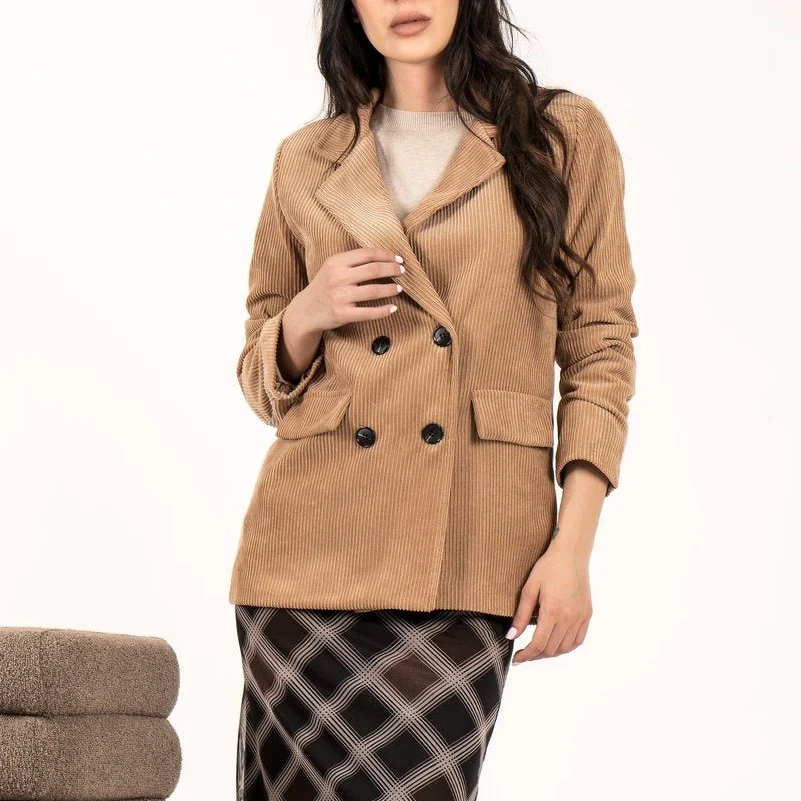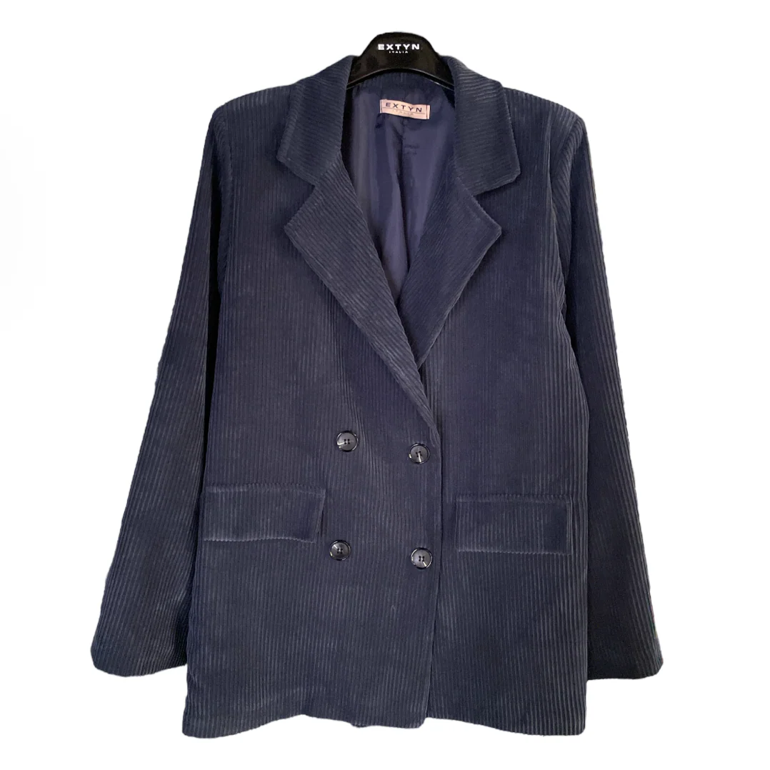 Giacca donna in tessuto velluto a coste. Vestibilità loose. Collo con revers regolari, chiusura doppio petto. Fodera in tessuto lucido. Composizione tessuto 87% poliestere 11% nylon 2% elastan.