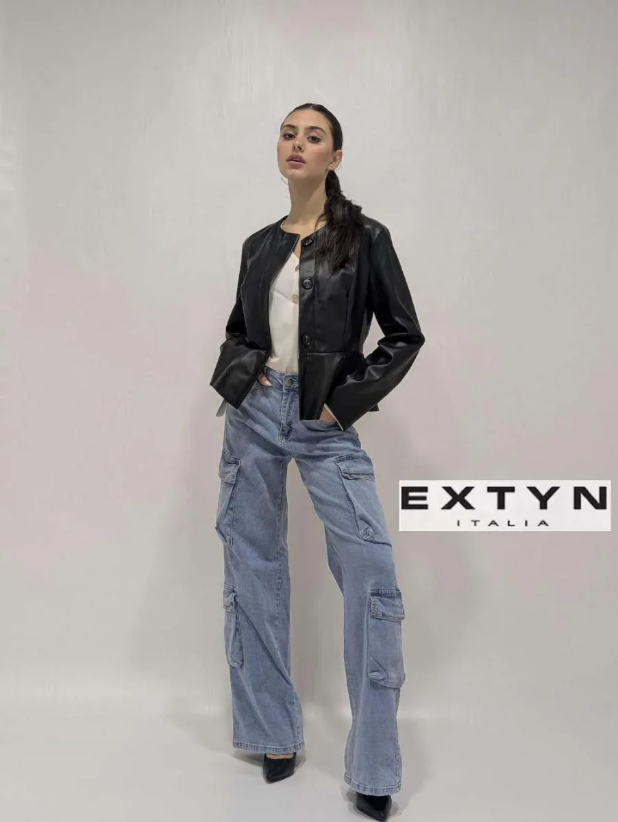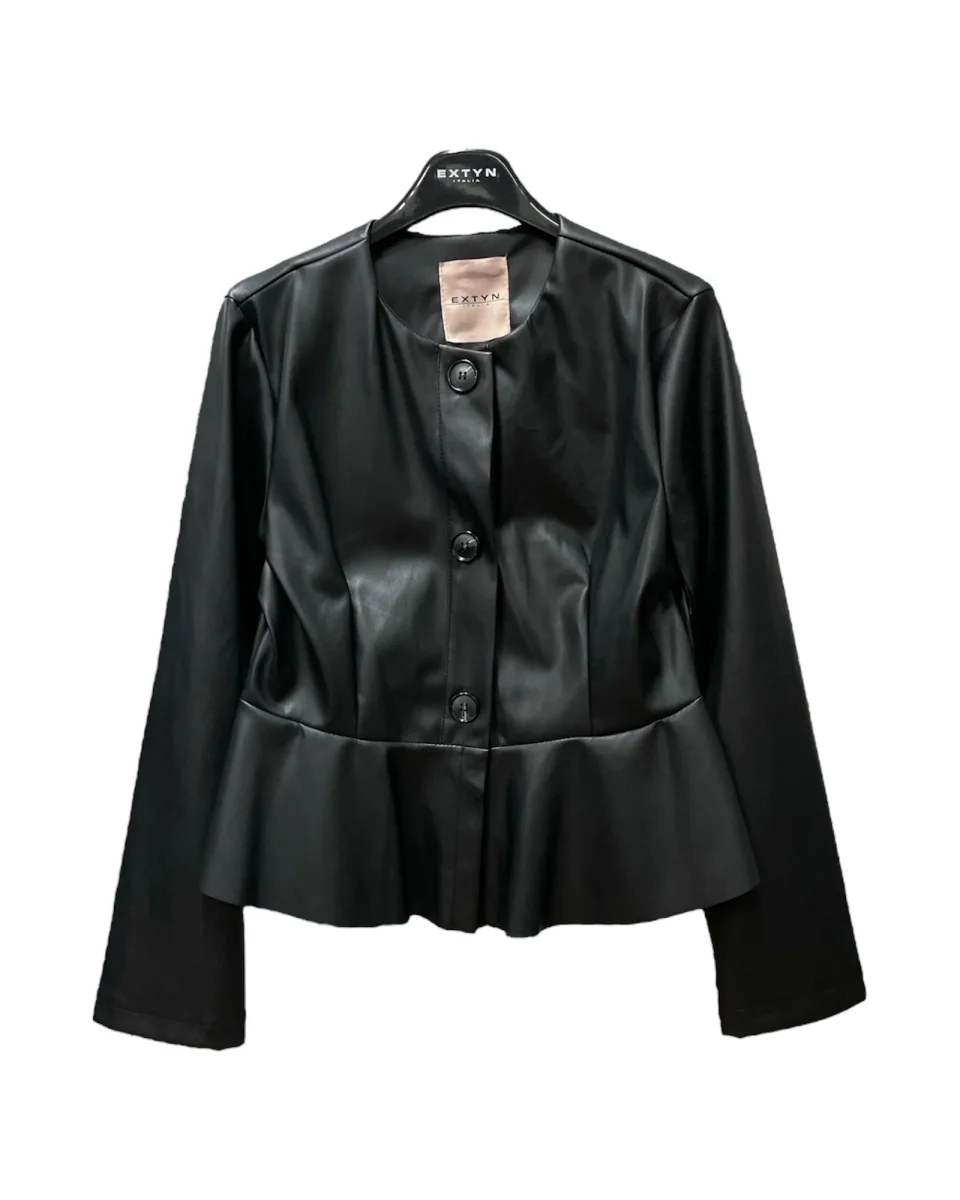 Giacca corta in ecopelle. Chiusura con bottoni in tinta, fondo con godet. Maniche lunghe. Bordi a taglio vivo, vestibilità regolare. Tessuto 100% poliuretano