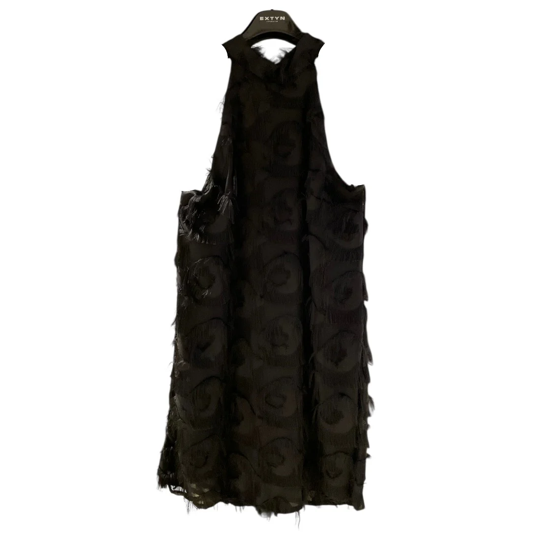 Vestito corto doppio tessuto vestibilità dritta. Fodera in tessuto elasticizzato, parte esterna in tessuto chiffon con motivo coda di pavone con fili applicati. Scollo all’americana, chiusura al collo con due bottoni. Composizione tessuto 100% poliestere.