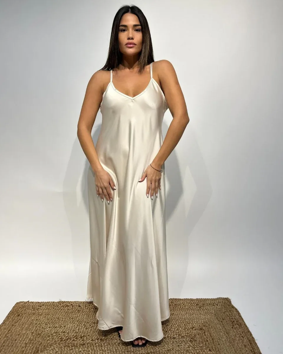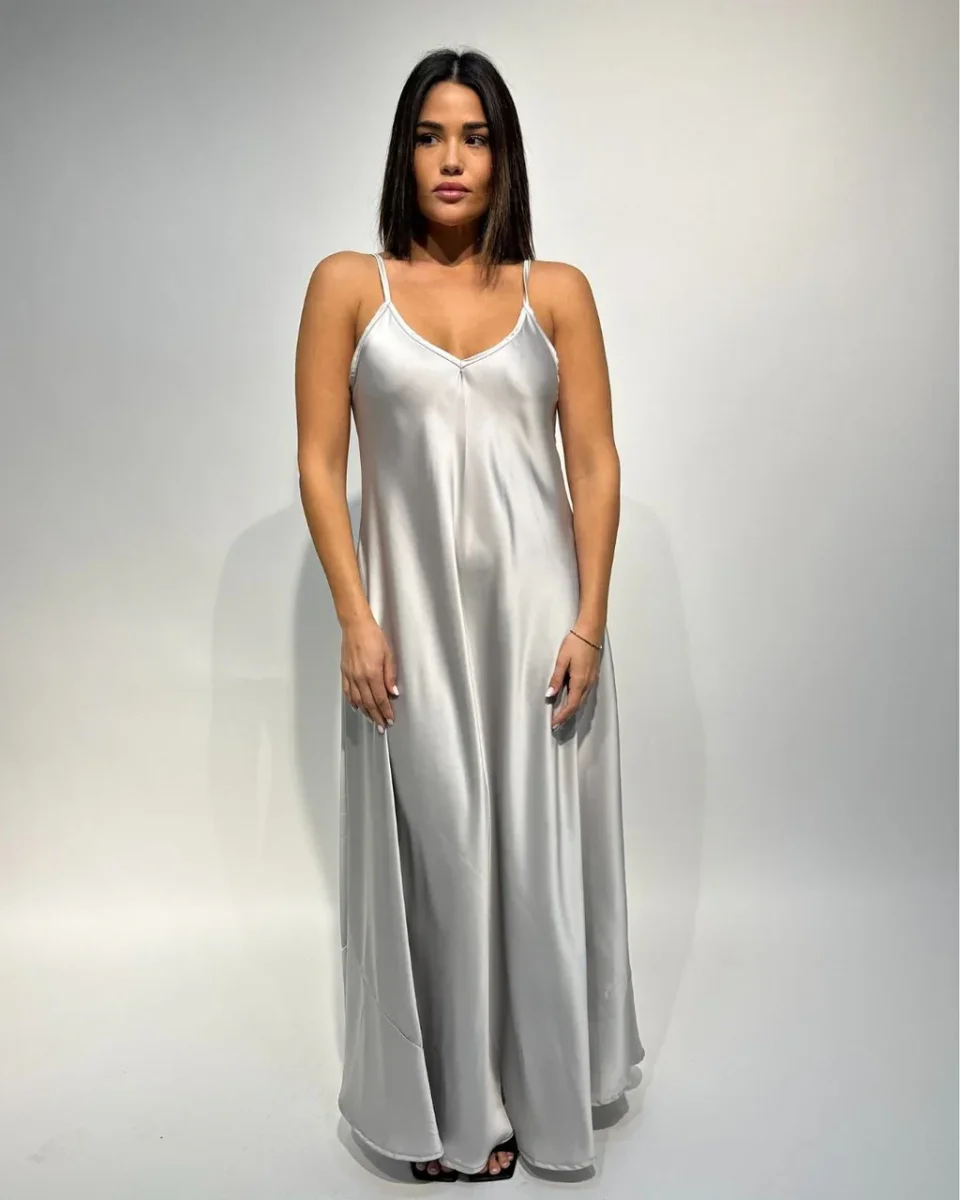 Vestito lungo modello sottoveste. Bretelle sottili, scollo a punta. Dettaglio tessuto aggiunto laterale con cucitura trasversale. Vestibilità ampia. Composizione tessuto 100% poliestere. Veste fino alla XL.