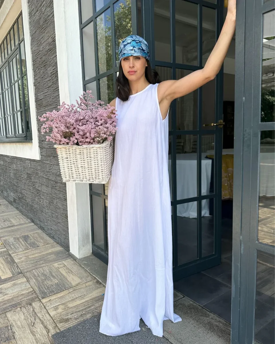 Vestito lungo oversize in viscosa lavorata effetto stropicciato. Girocollo regolare, goccia sulla schiena con bottone al collo. Tasche laterali nascoste. Vestibilità molto ampia. Composizione tessuto 90% viscosa 10% nylon.