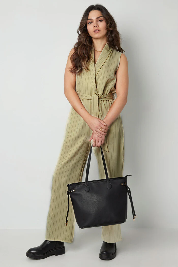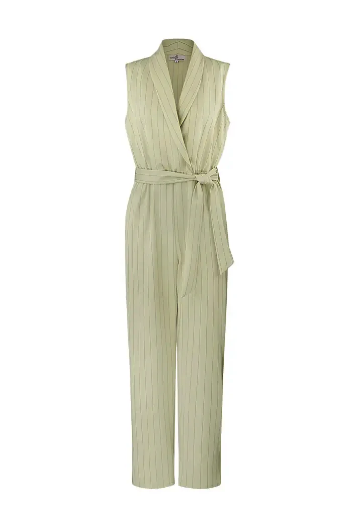 Tuta in tessuto tecnico. Collo sciallato effetto giacca, senza maniche, corpetto vestibilità ampia. Vita con elastico e fusciacca. Tasche laterali. Pantalone gamba palazzo. Vestibilità regolare, il capo non ha chiusure. Per visualizzare la tabella taglie clicca qui .