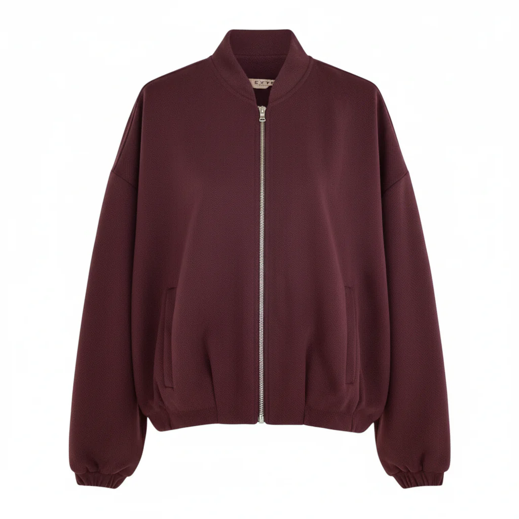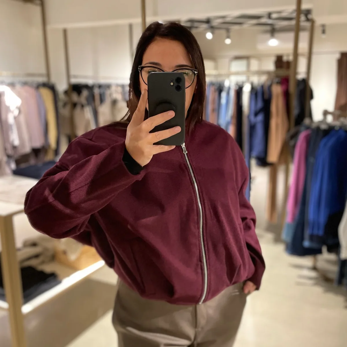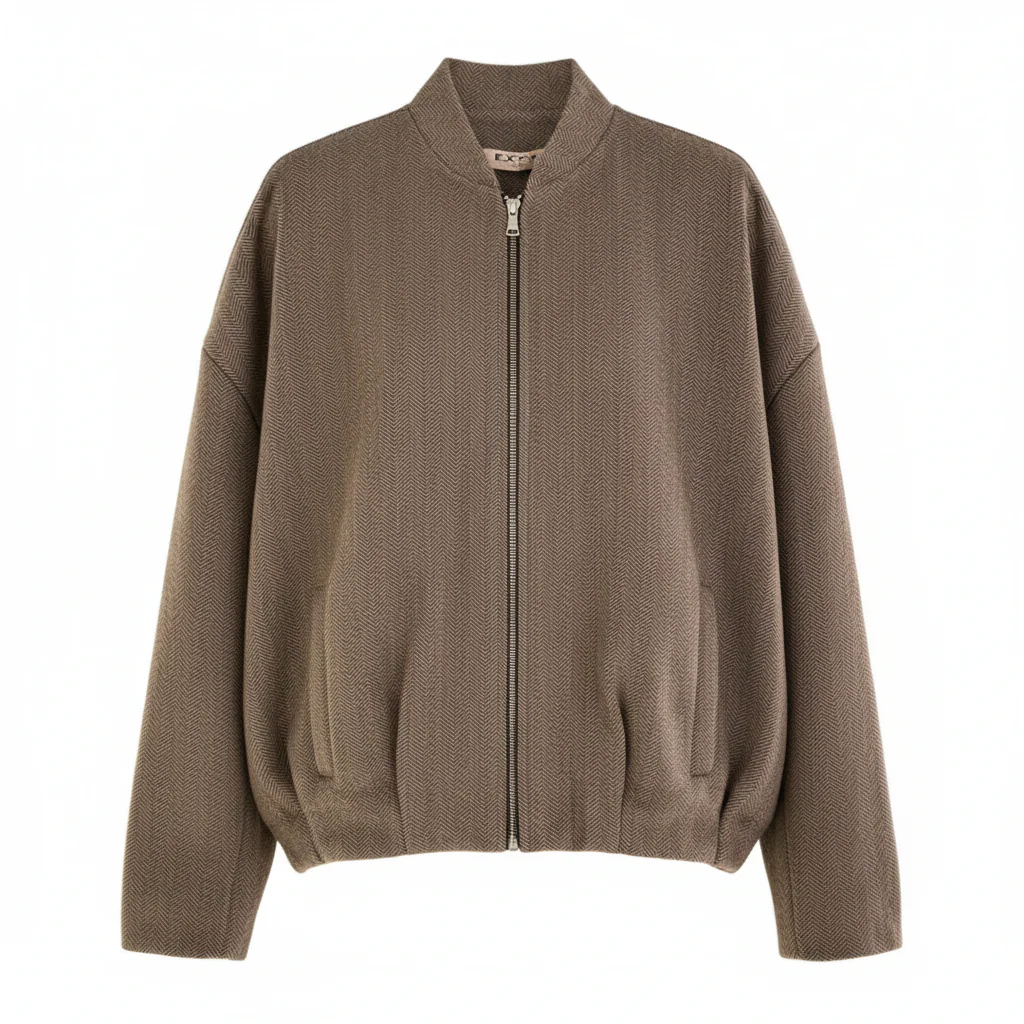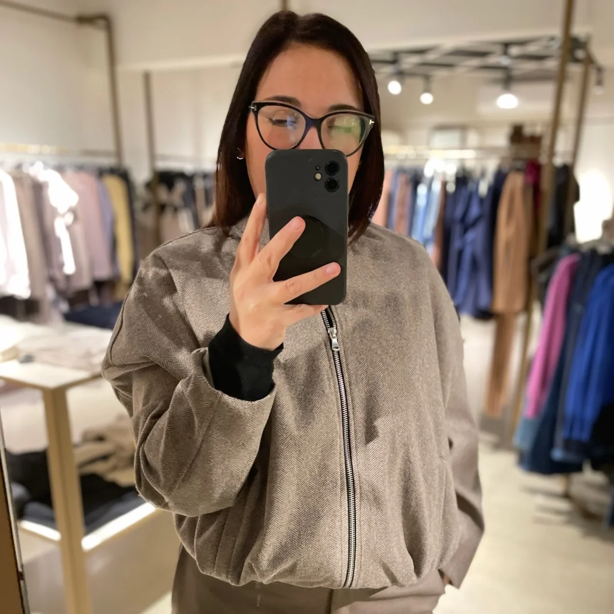 Giubbino modello bomber in tessuto resca mano lana. Colletto pistagna, chiusura con zip centrale, tasche laterali. Fondo elasticizzato per modulare la vestibilità. Motivo spigato tono su tono, capo foderato. Composizione tessuto 100% poliestere