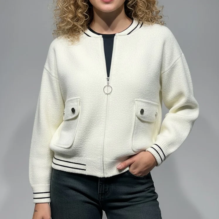 Giubbino donna modello bomber in tessuto maglia mano lana. Collo, polsini e fondo elastici con bande in colore a contrasto, tasche applicate, zip a chiudere con gancio. Vestibilità regolare, dalla XS comoda alla L giusta. Composizione tessuto 100% viscosa.