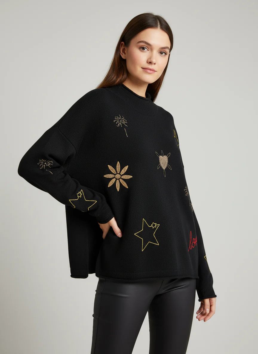 Maglia donna oversize in viscosa. Collo vulcano rifinito a costine, spalla raglan, vestibilità molto comoda. Dettagli ricamati sul davanti e sulle maniche. Composizione tessuto viscosa.