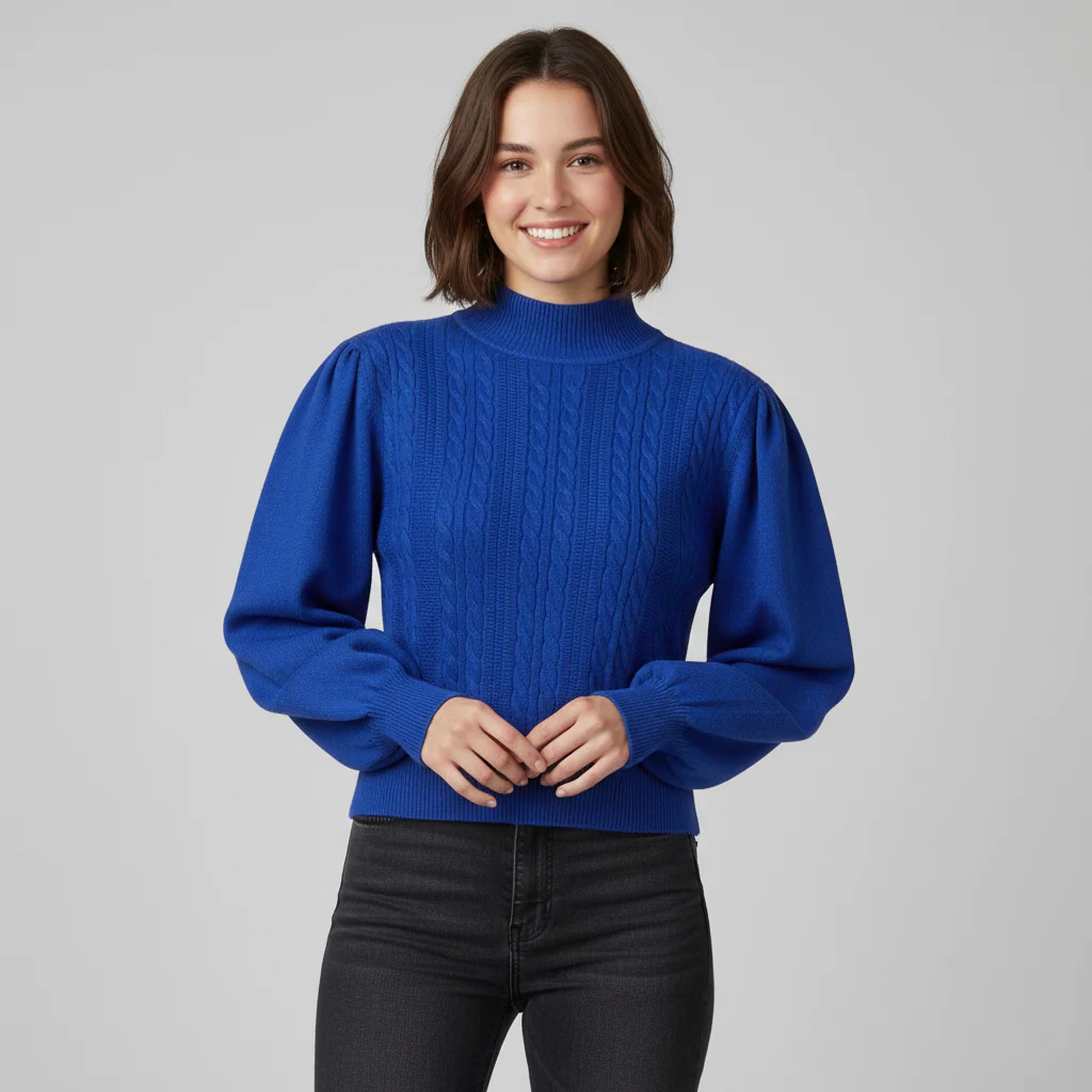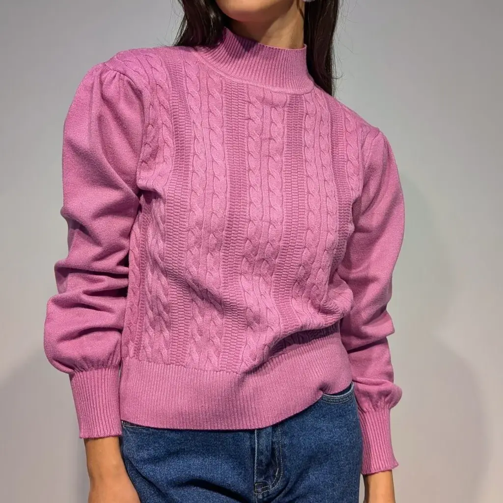 Maglia donna in tessuto viscosa soft touch. Collo lupetto, motivo a trecce sul davanti. Spalle arricciate, maniche ampie con fondo a palloncino. Polsini, collo e fondo rifiniti a coste. Vestibilità dritta.