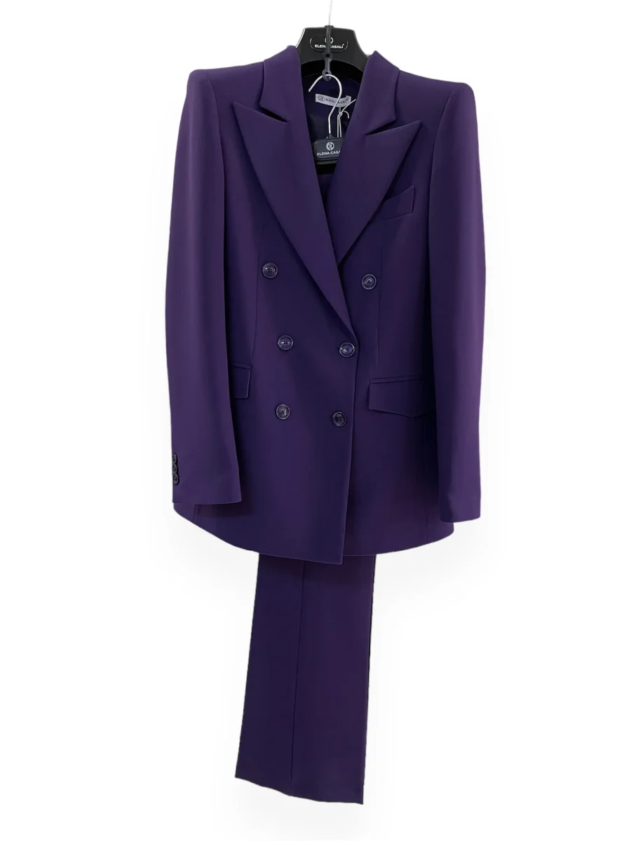 Tailleur in tessuto tecnico leggermente elasticizzato. Giacca doppio petto con bottoni in tinta, spallina pronunicata stile anni 80. Vestibilità dritta. Pantalone vita medio/alta, chiusura con zip e bottone, tasche a filo laterali. Gamba stretta e fondo a zampa. Composizione tessuto 63% poliestere 34% viscosa 3% elastan.
