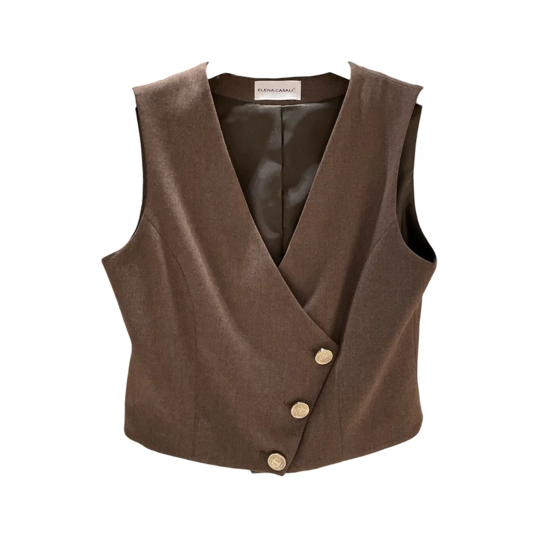 Tailleur donna tre pezzi in tessuto tecnico effetto melangé. Giacca lunga, collo con revers regolari, chiusura con bottone dorato centrale. Gilet corto con abbottonatura laterale, bottoni dorati. Pantalone vita medio/alta, chiusura con bottone e zip, tasche a filo laterali. Gamba e fondo dritti. Vestibilità regolare.