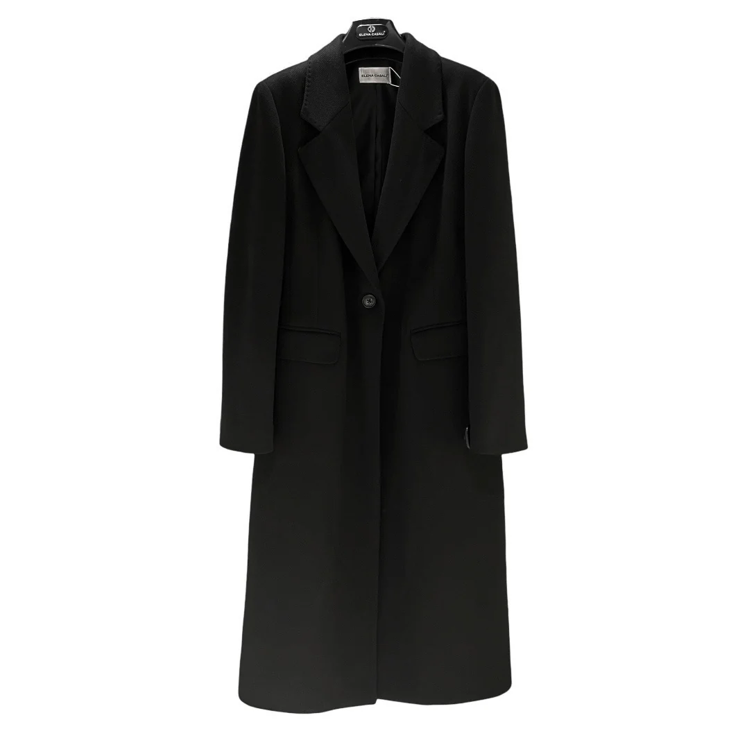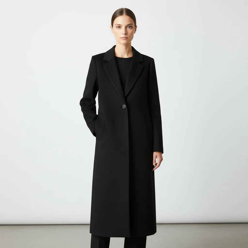 Cappotto lungo in tessuto panno velour soft touch. Collo con revers classici, chiusura con bottone centrale, dettaglio impunture sulla lunghezza, tasche con pattina applicata. Capo foderato. Vestibilità slim dritta.
