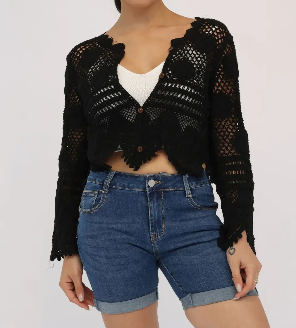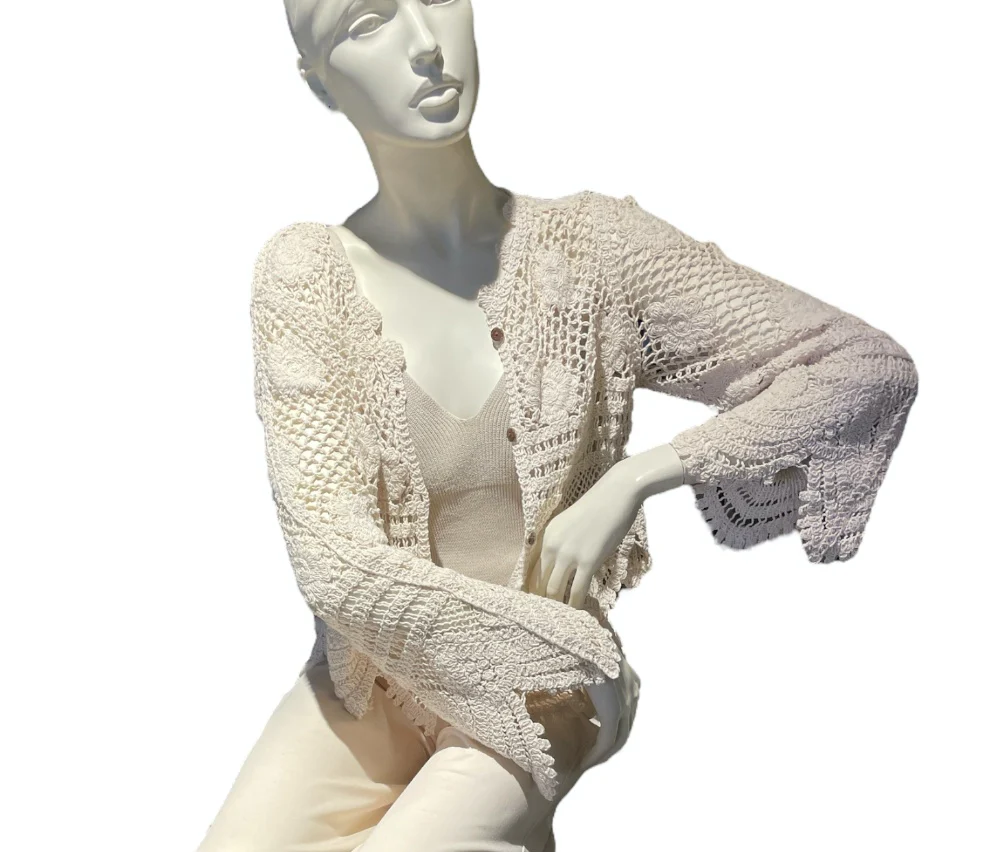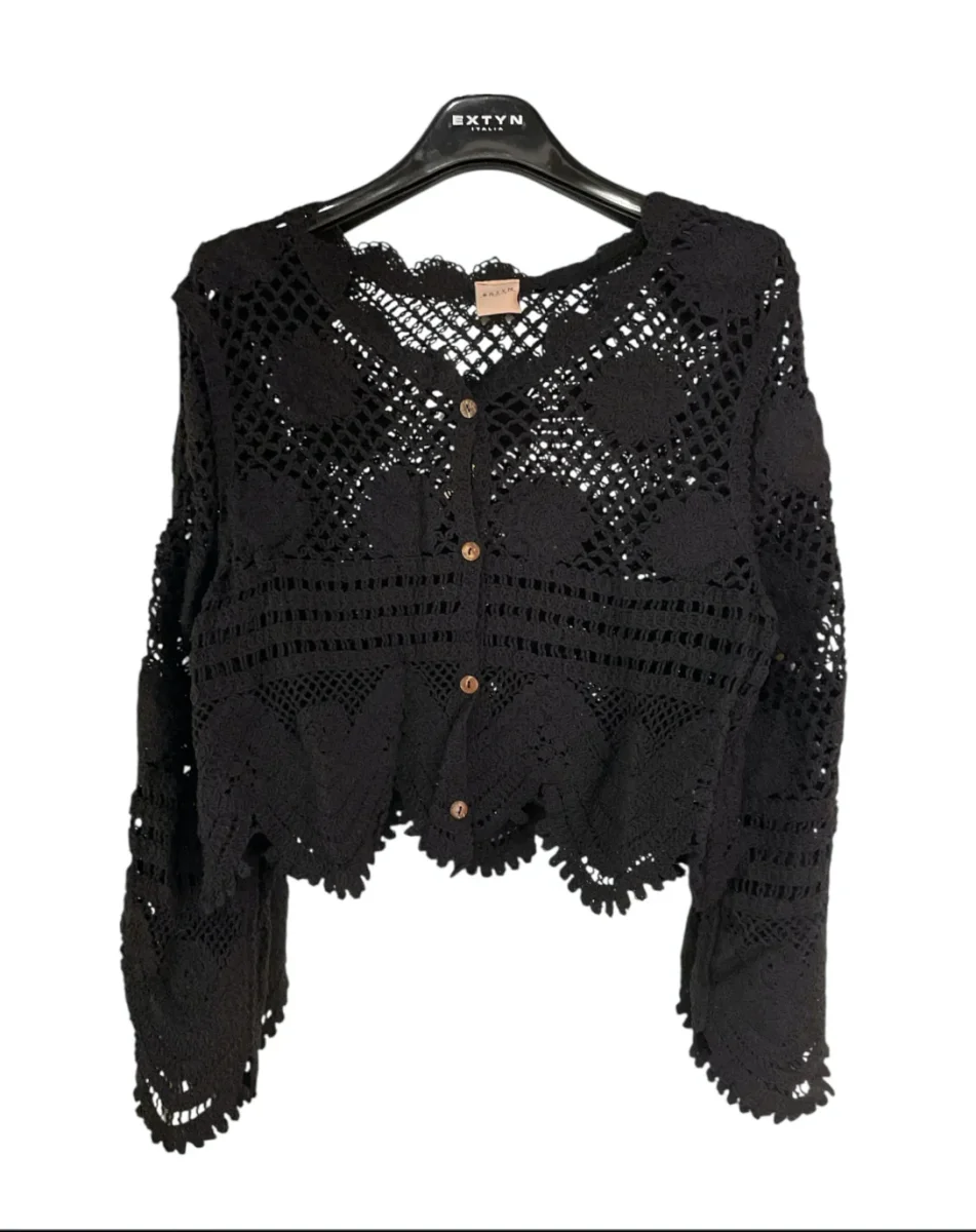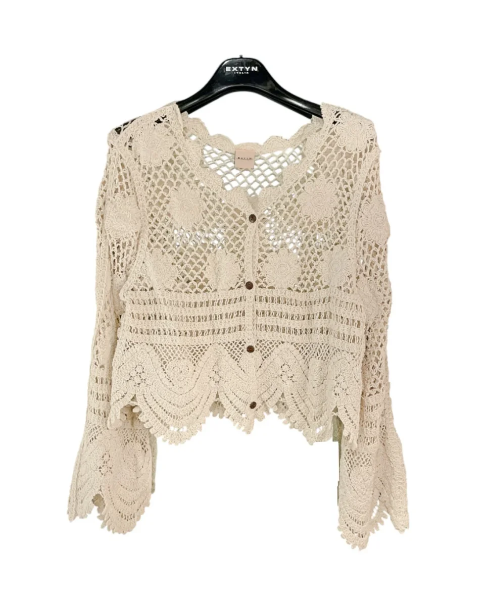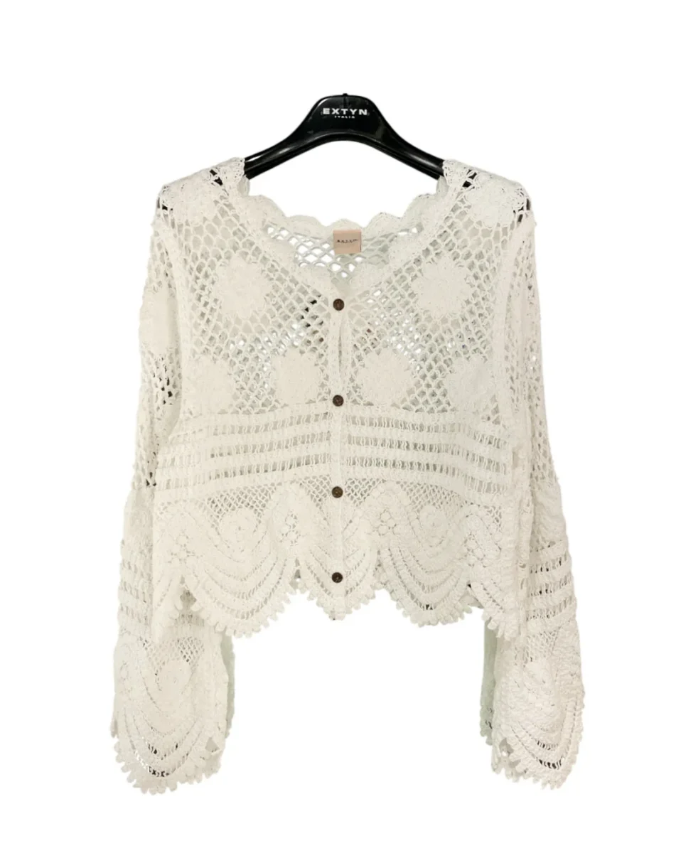Cardigan in tessuto lavorato ad uncinetto. Maniche lunghe con fondo ampio. Scollo tondo e bordi effetto ad onde, chiusura con bottoni in legno. Vestibilità regolare. Composizione tessuto 97% cotone 3% nylon.