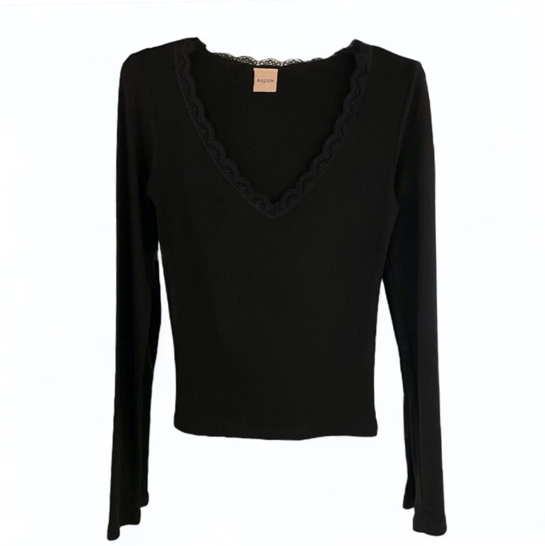 T-shirt donna in cotone elasticizzato. Scollo a punta con bordo in pizzo. Lavorazione del tessuto a costine. Vestibilità aderente. Veste dalla XS alla M (o L molto corta). Composizione tessuto 93% cotone 7% elastan.