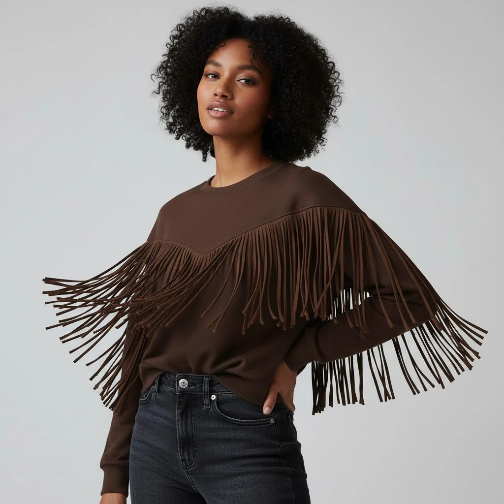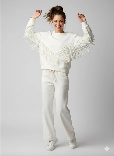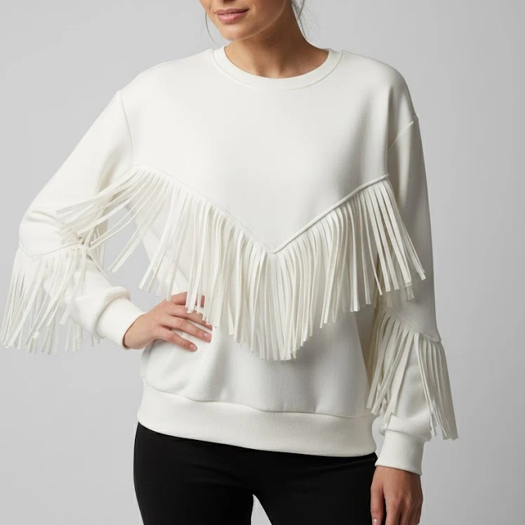 Felpa donna in morbido tessuto misto viscosa. Girocollo regolare, spalla raglan. Cucitura sulla lunghezza con frange applicate sul davanti e sulle maniche. Crea la tuta con il pantalone abbinato. Veste dalla XS comoda alla L giusta. Composizione tessuto 50% poliestere 45% viscosa 5% elastan.