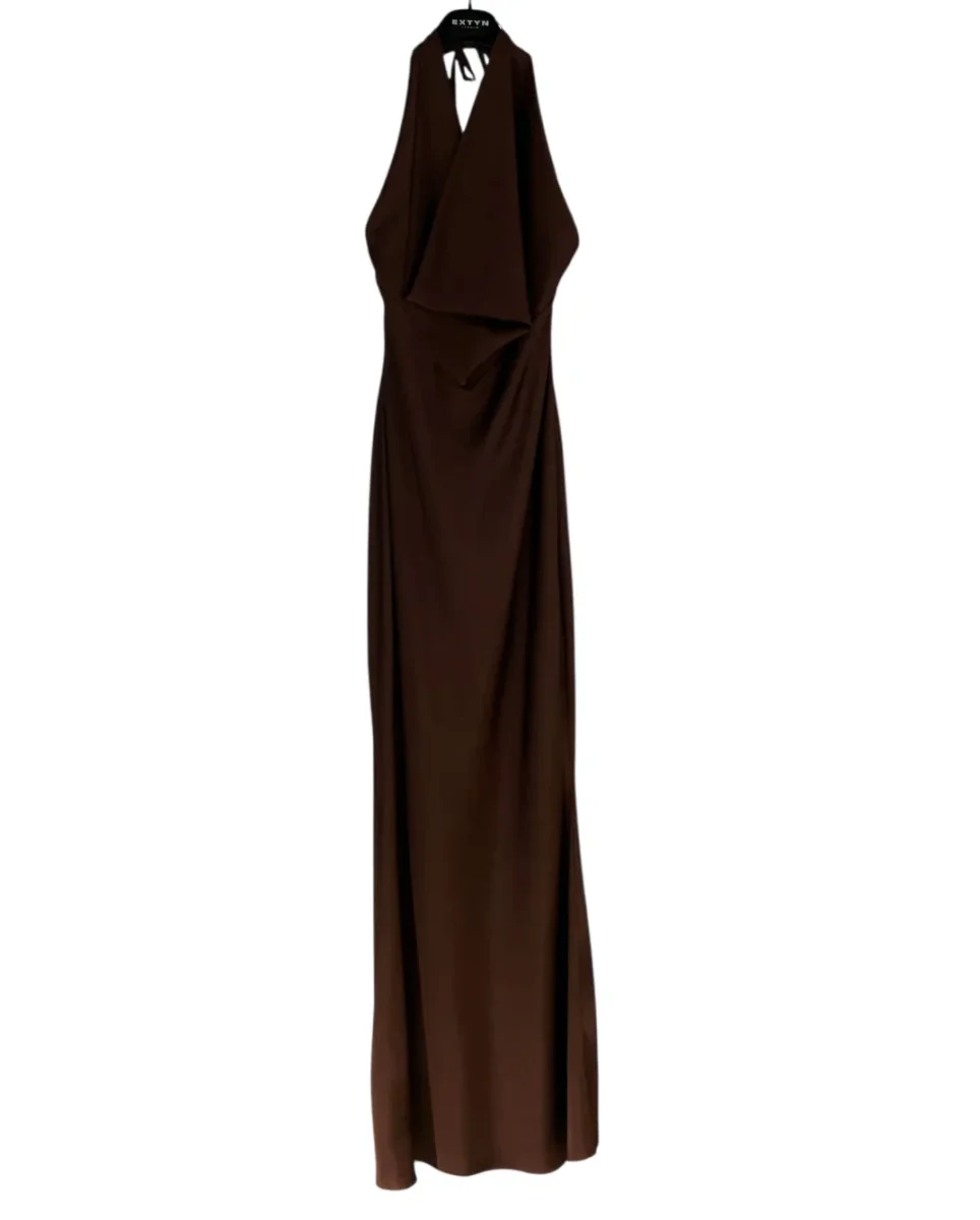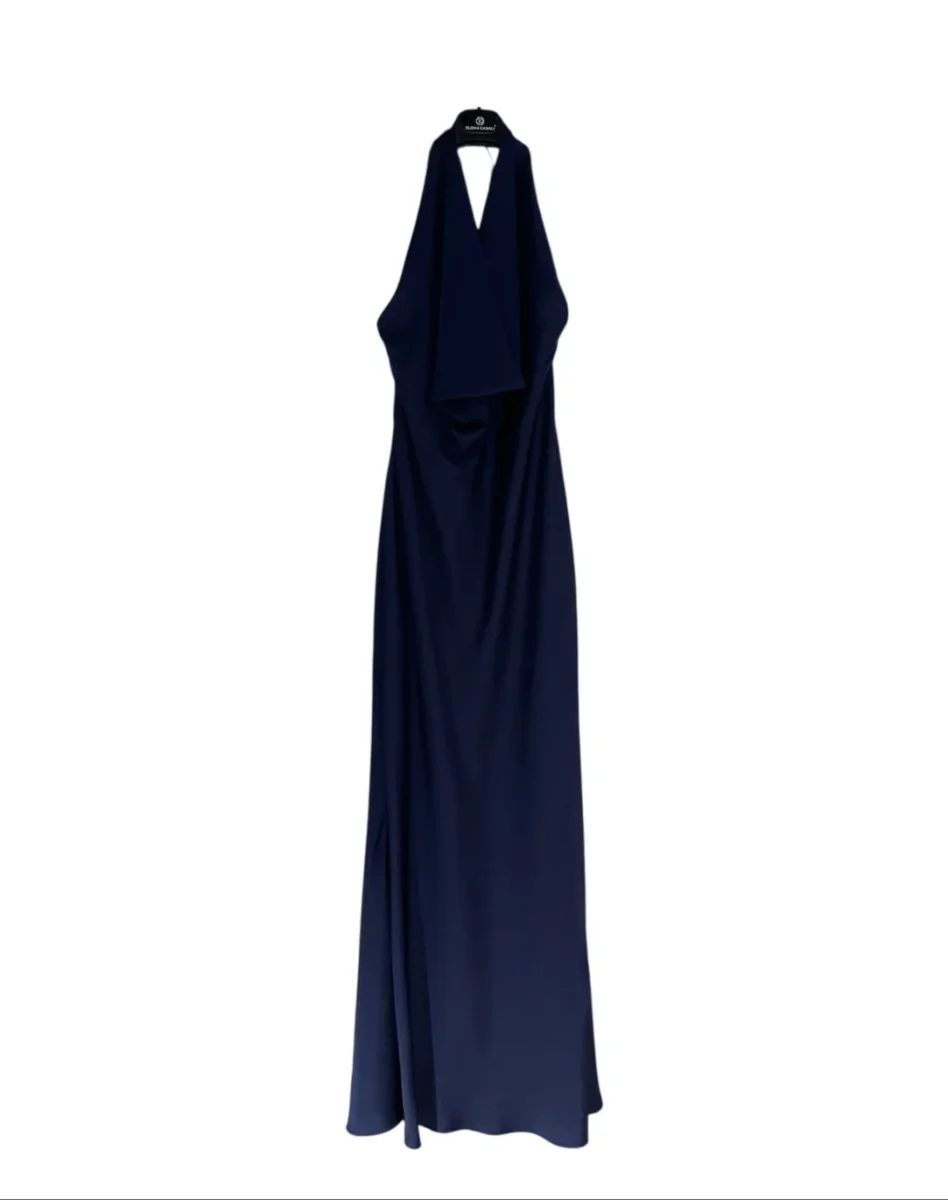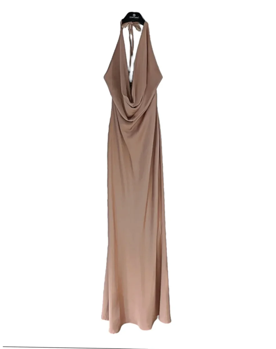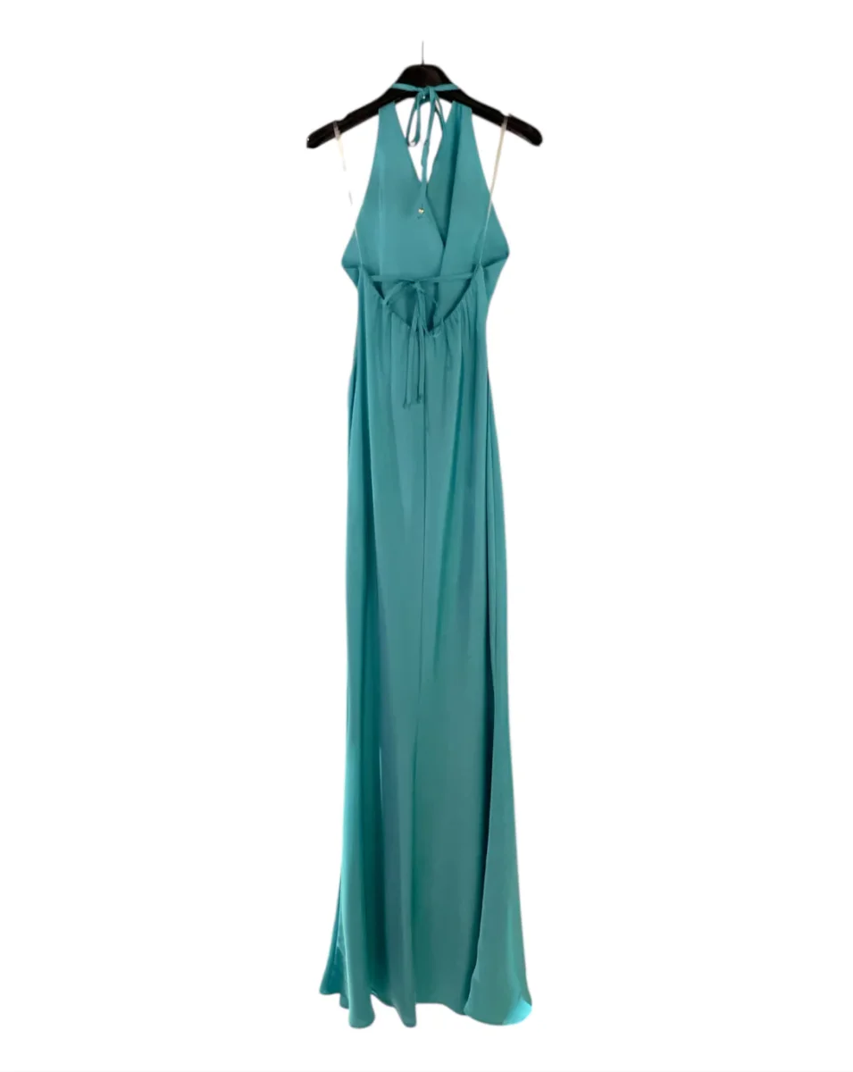 Vestito lungo in tessuto rasato lucido. Scollo a cascata con laccetti al collo e sulla schiena, elastico nella parte posteriore, schiena scoperta. Vestibilità a sirena, sottogonna in tinta. Composizione tessuto 100% poliestere.