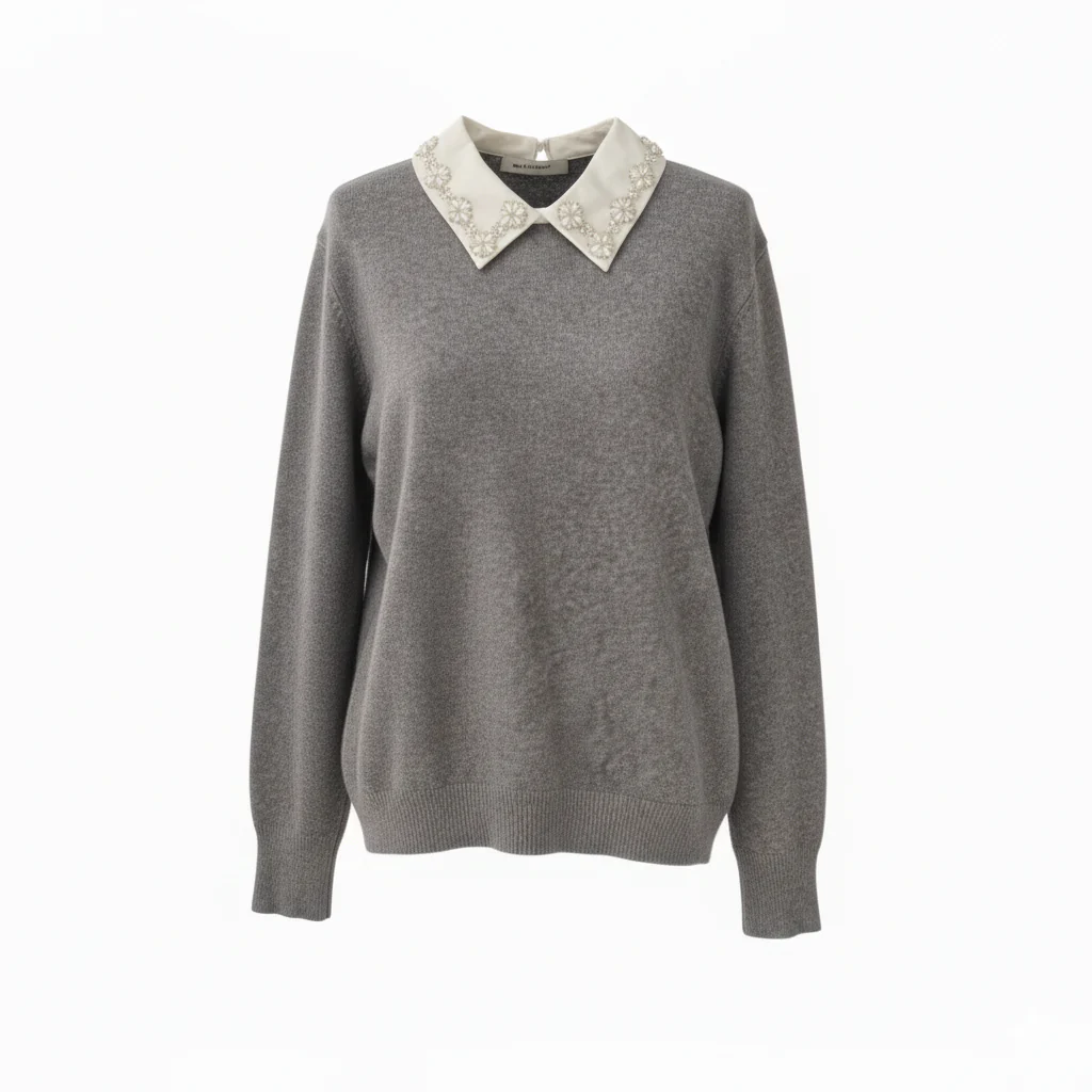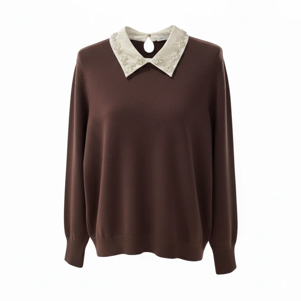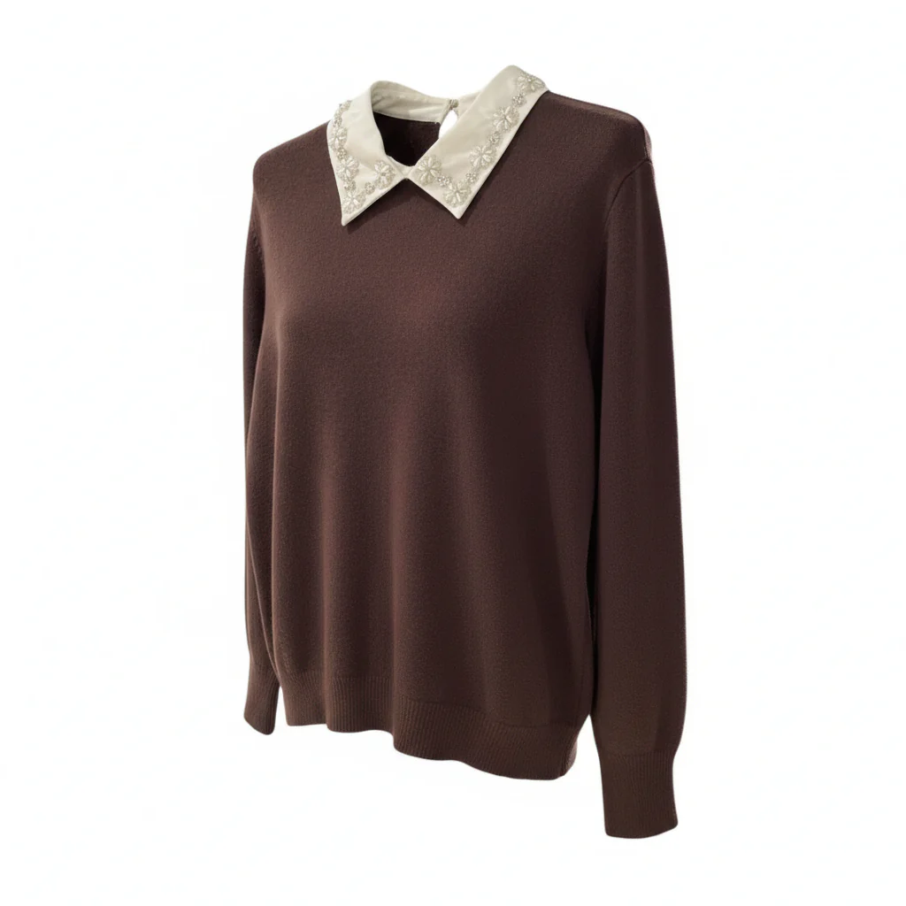 Maglia donna in tessuto misto viscosa mano lana con colletto camicia applicato. Colletto in tessuto con strass e perle applicati motivo floreale, chiusura con bottoncino al collo. Maniche lunghe con polsini elasticizzati e fondo a sbuffo. Vestibilità regolare. Composizione tessuto 50% viscosa, 30% poliammide 20% nylon.