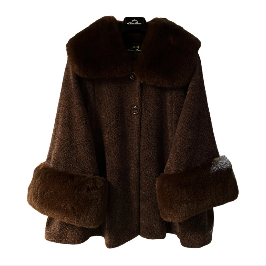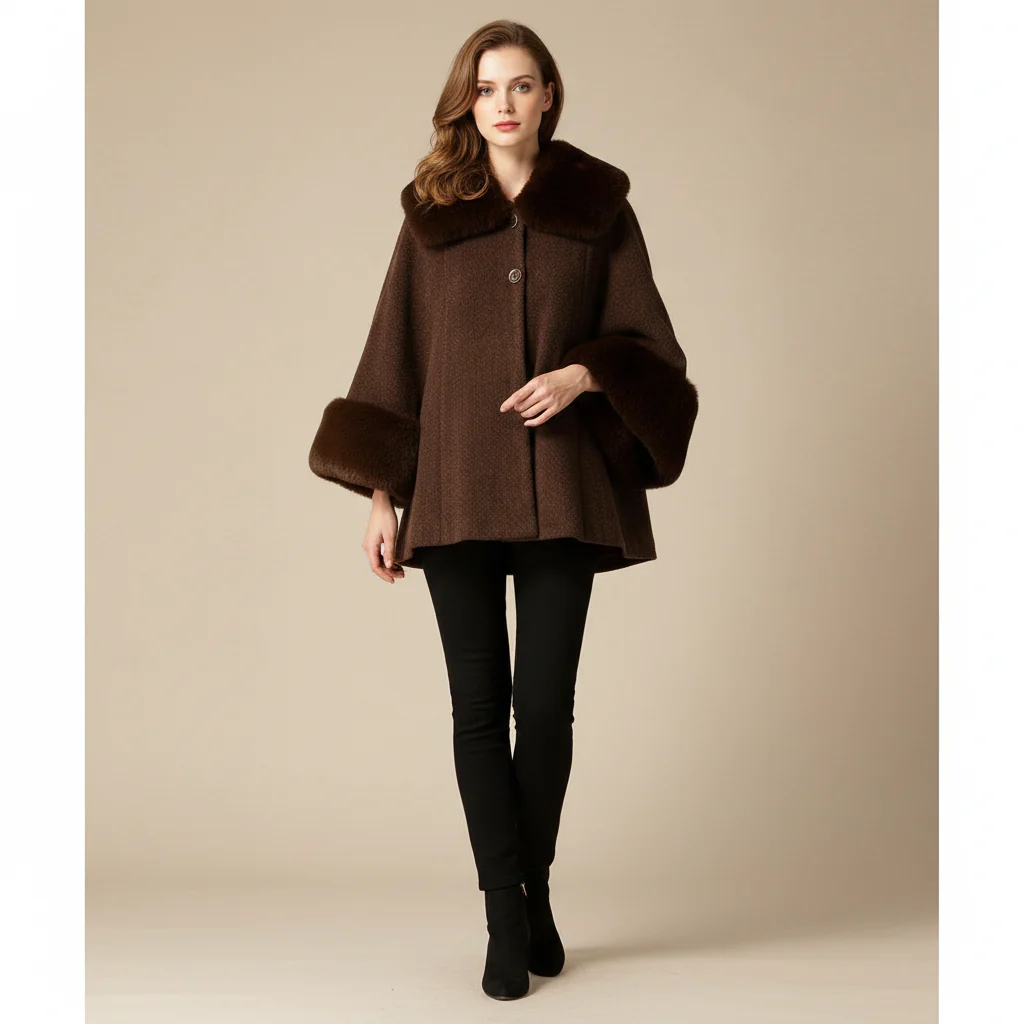 Mantella in tessuto soft touch con colletto e polsini in ecopelliccia. Chiusura con bottoni in tinta, tasche laterali. Vestibilità ampia.