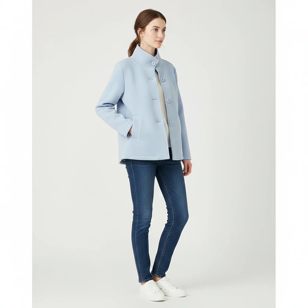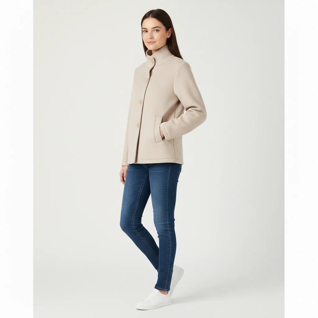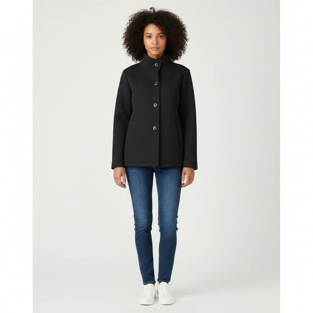 Cappottino corto modello caban in tessuto scuba lavorato. Collo pistagna, chiusura con bottoni in tinta, tasche a filo laterali con bordo largo. Interno in tessuto scuba liscio. Vestibilità a trapezio, veste dalla XS alla L. Composizione tessuto 96% poliestere 4% elastan.