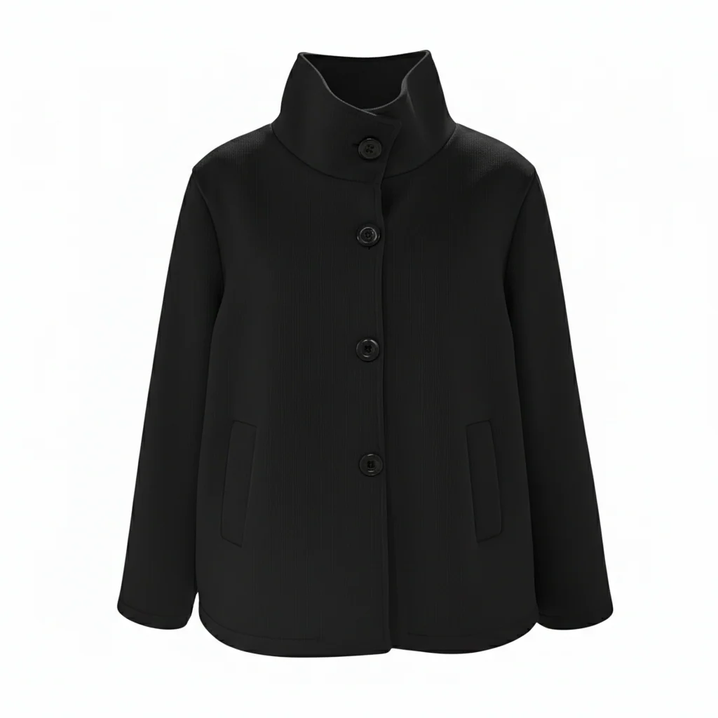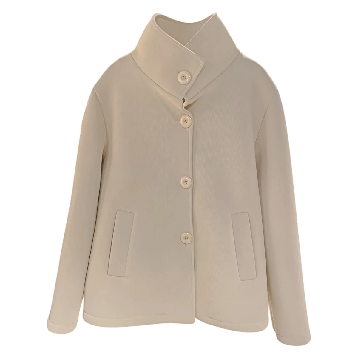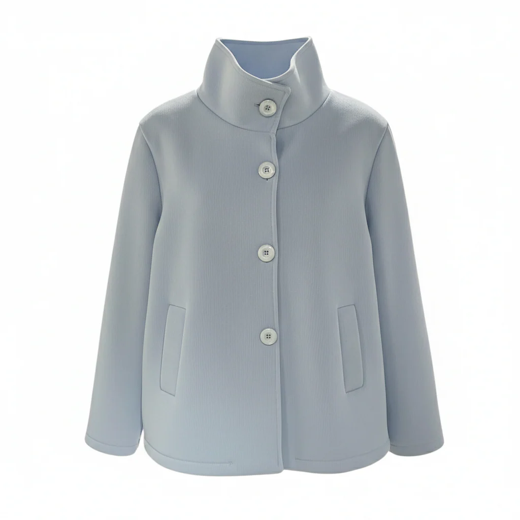 Cappottino corto modello caban in tessuto scuba lavorato. Collo pistagna, chiusura con bottoni in tinta, tasche a filo laterali con bordo largo. Interno in tessuto scuba liscio. Vestibilità a trapezio, veste dalla XS alla L. Composizione tessuto 96% poliestere 4% elastan.