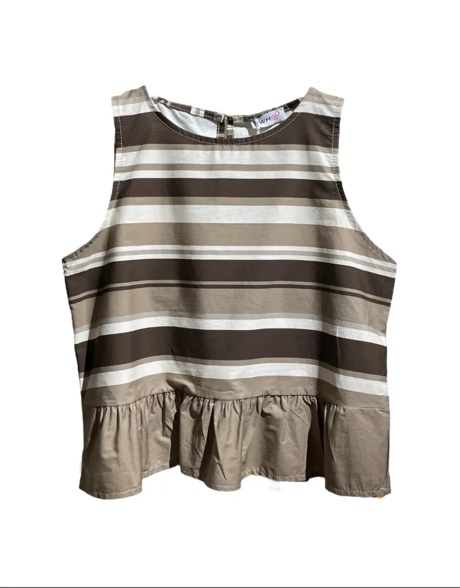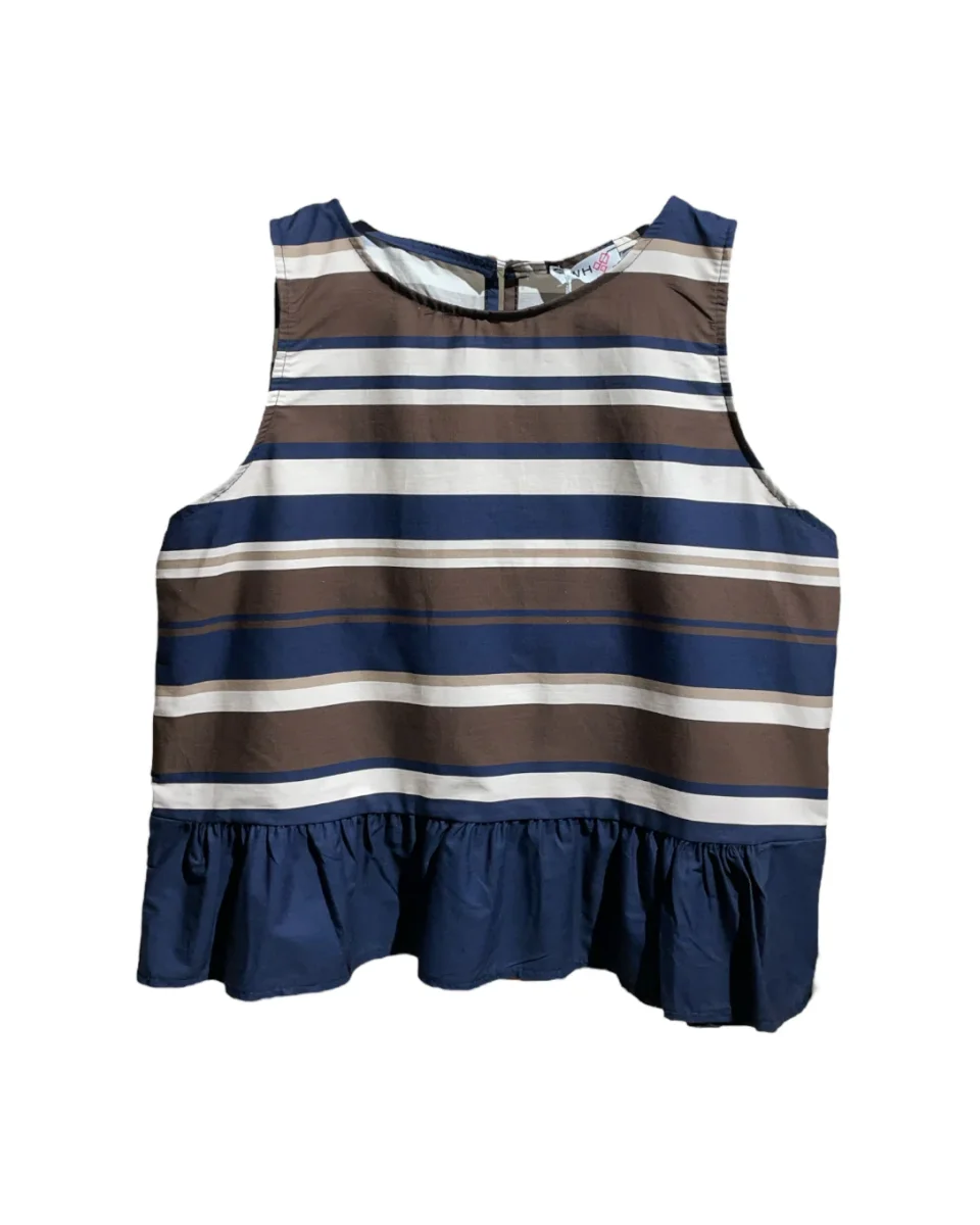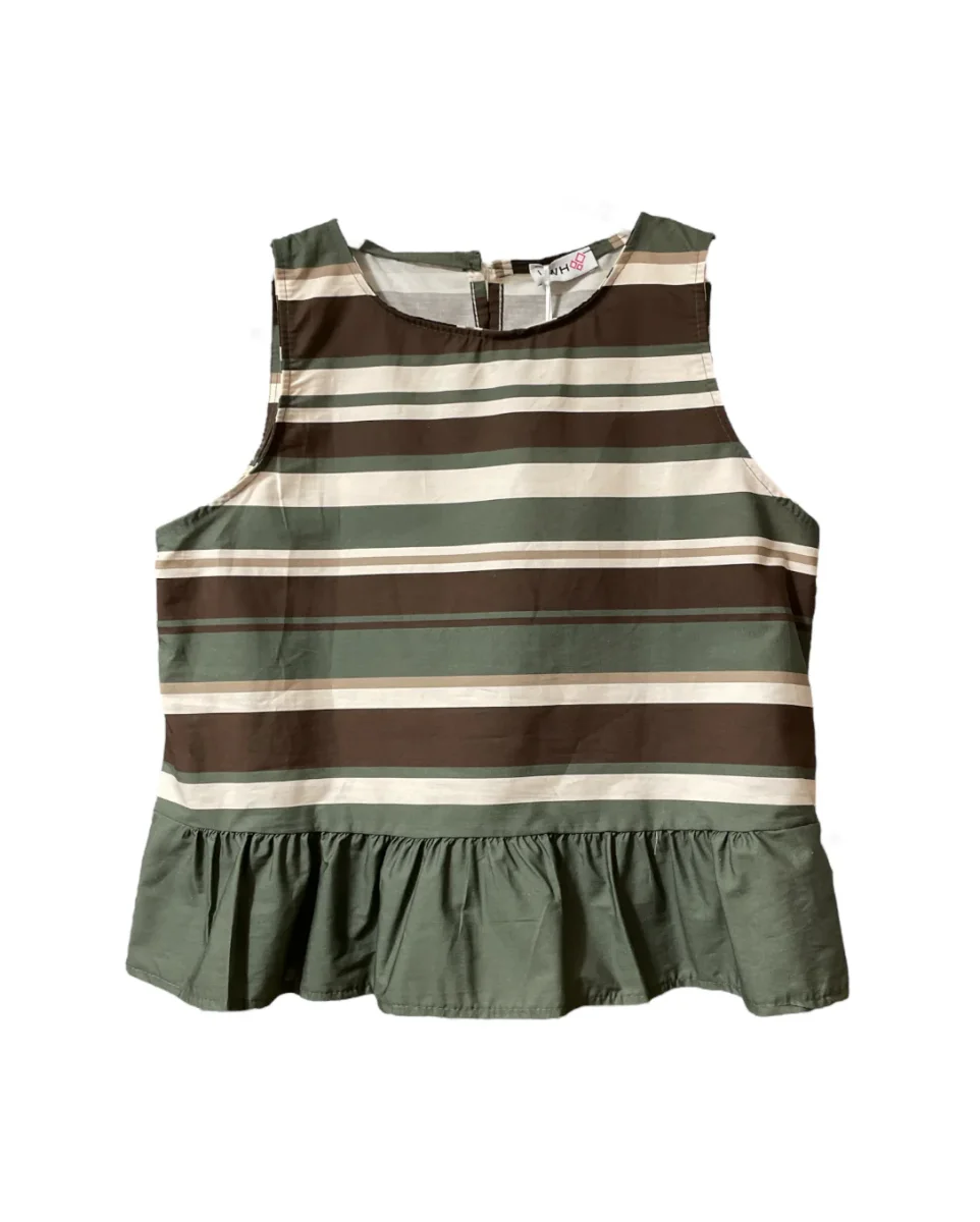Top in tessuto stampato 100% cotone. Girocollo regolare, chiusura con bottone al collo, goccia sulla schiena. Vestibilità dritta, rouches sul fondo. Motivo righe larghe con colori a contrasto. Vestibilità regolare. Crea il completo con la gonna abbinata.