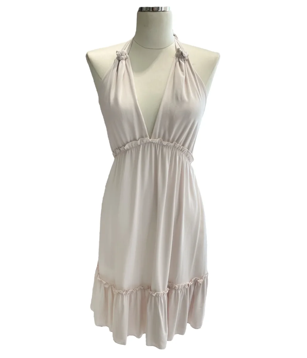 Vestito corto in tessuto 100% viscosa. Scollo a V con bustino a triangolo, chiusura con doppio laccetto al collo e laccetto sulla schiena. Elastico in vita. Gonna corta con balza sul fondo. Taglia unica, veste dalla XS alla L.