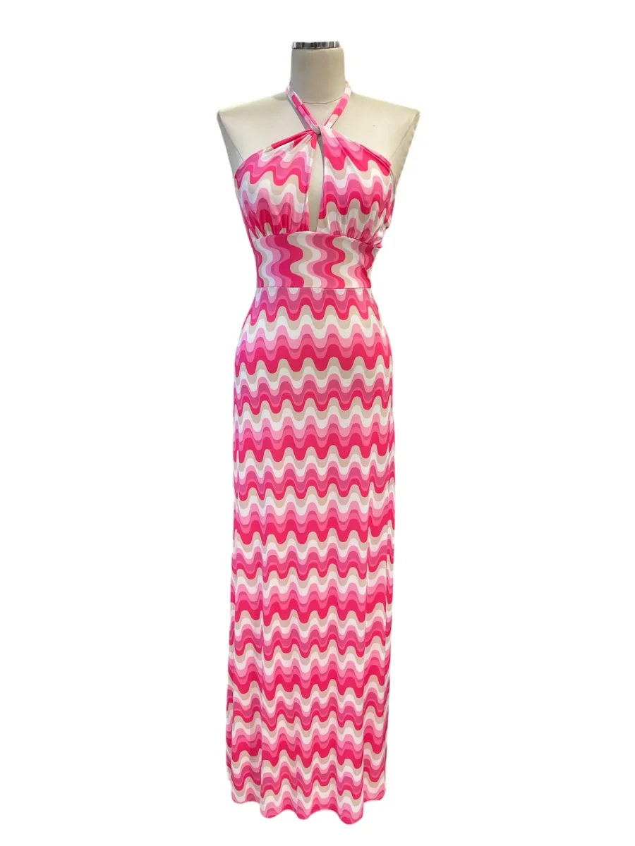 Vestito lungo in tessuto leggero jersey elasticizzato. Scollo con coppe a triangolo, goccia al centro e laccio al collo. Fascia elastica alta in vita, gonna lunga. Vestibilità morbida. Taglia unica, veste dalla XS alla L. Composizione tessuto 100% poliestere.