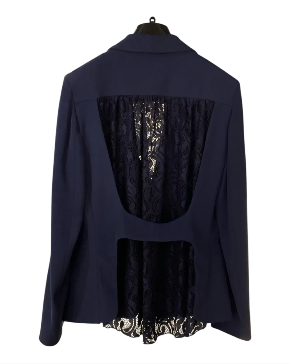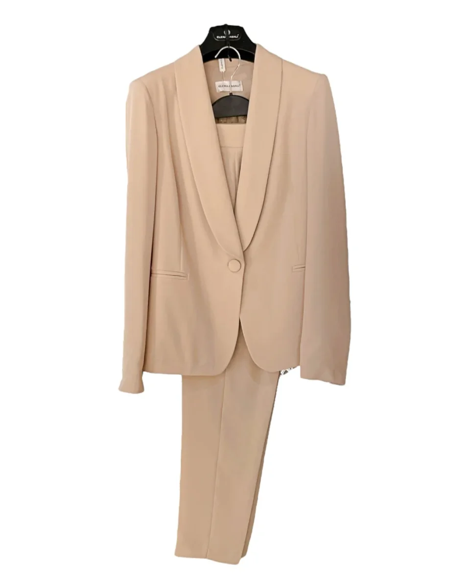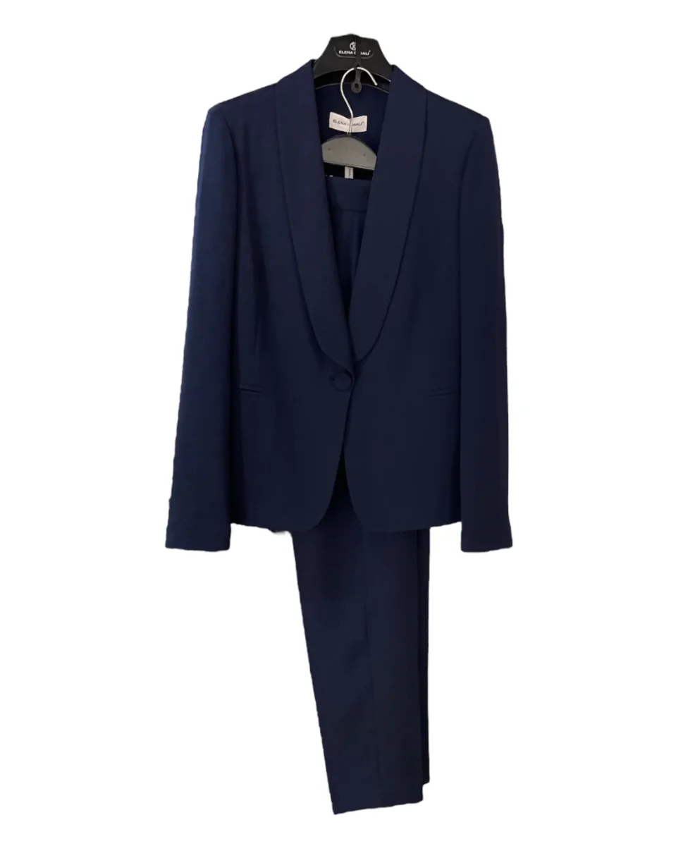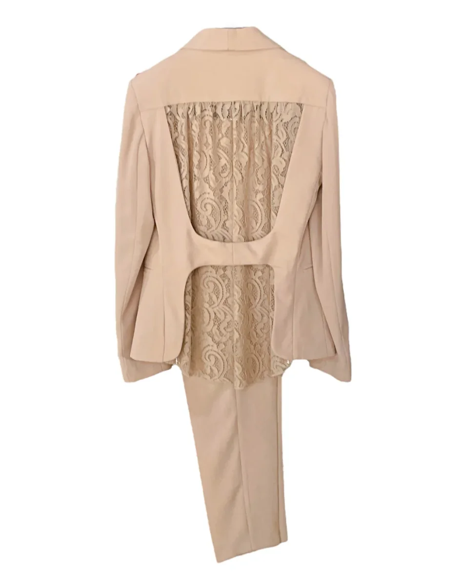 Tailleur in tessuto tecnico elasticizzato con inserti in pizzo. Giacca con collo sciallato, chiusura centrale con bottone rivestito in tessuto. Inserto in pizzo su tutta la schiena. Pantalone vita regolare, chiusura con zip e bottone, gamba e fondo stretti. Vestibilità slim. Composizione tessuto 95% poliestere 5% elastan.