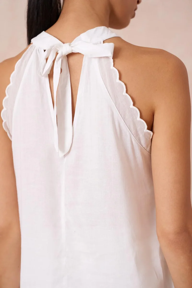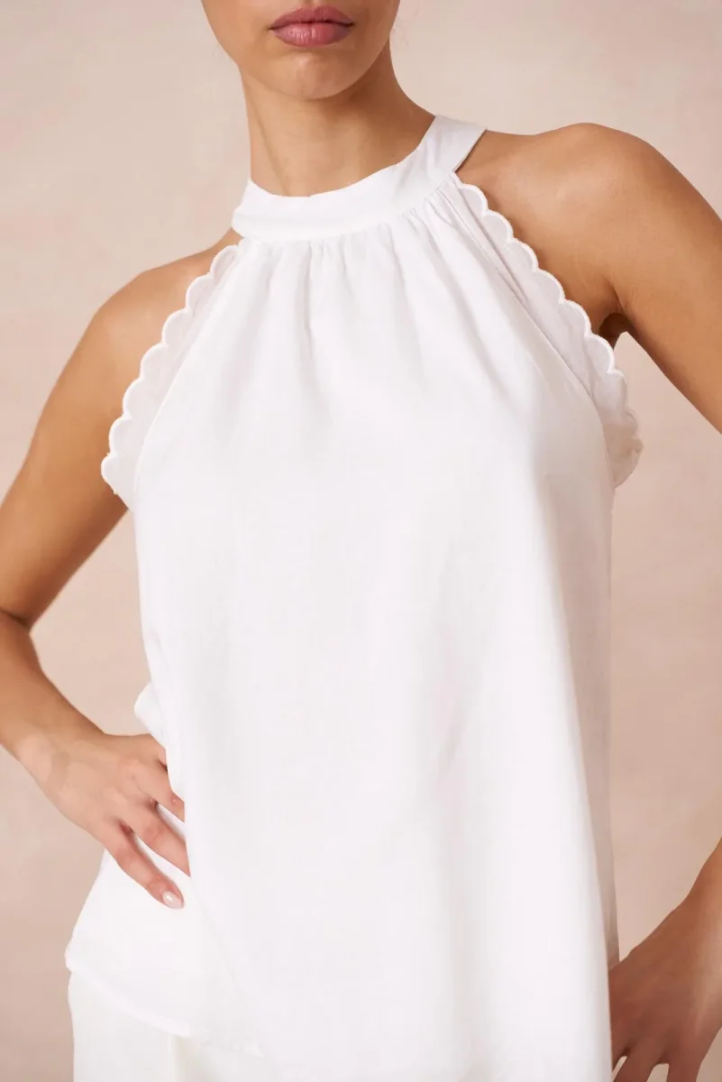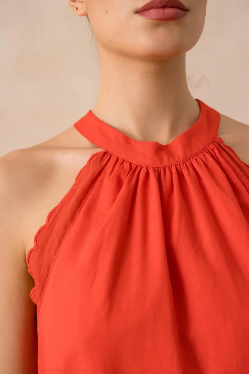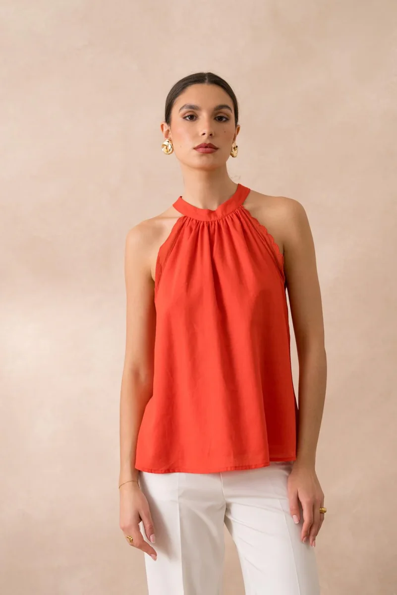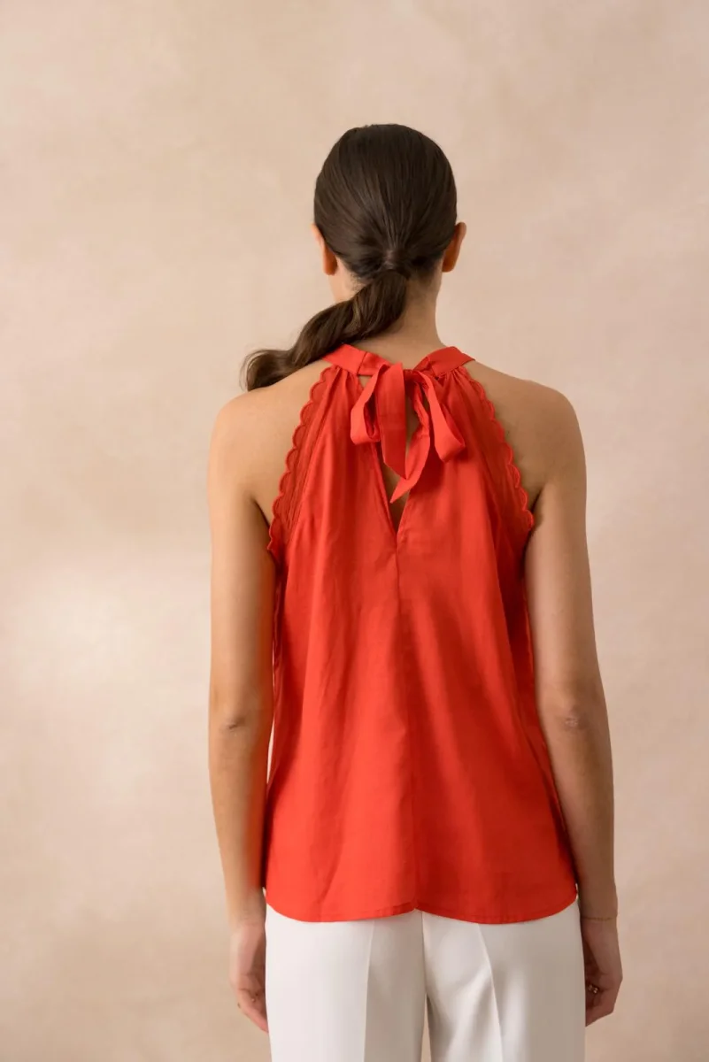 Top in tessuto tecnico morbido. Scollo america con chiusura con fiocco al collo, bordi ad onde. Lunghezza e vestibilità regolari. Taglia in foto S. Composizione tessuto 100% poliestere.