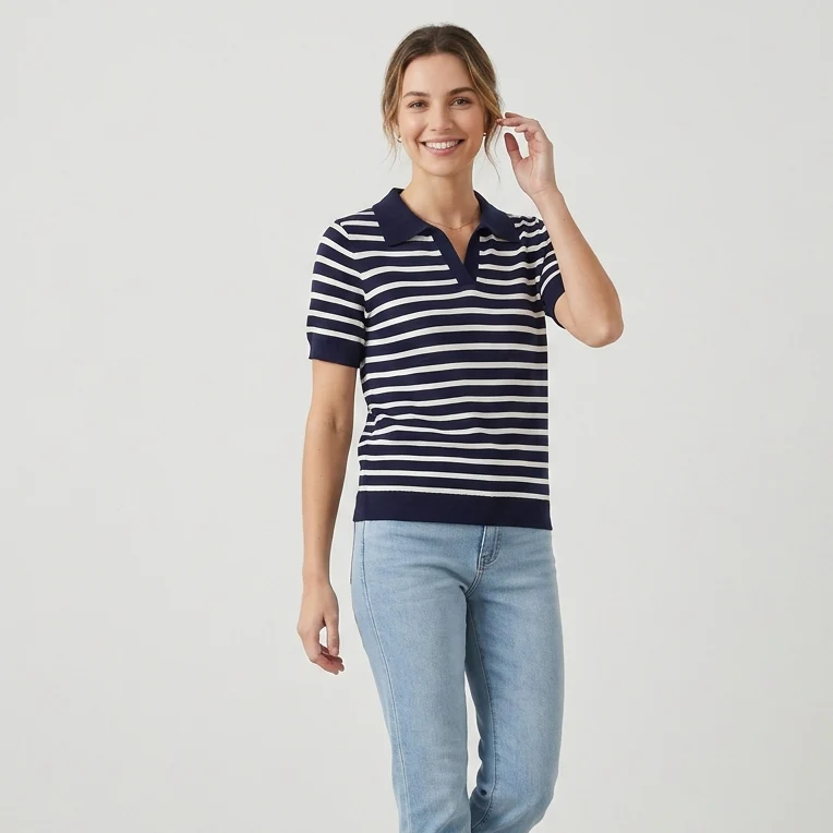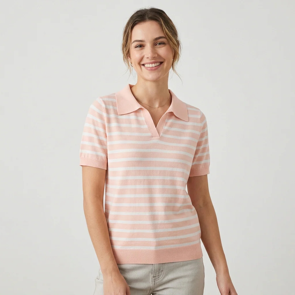 Polo donna in tessuto leggero misto viscosa. Colletto classico con scollo a punta senza bottoni, bordi in tessuto rifinito a canaletti. Vestibilità regolare. Composizione tessuto 70% viscosa 30% poliestere.