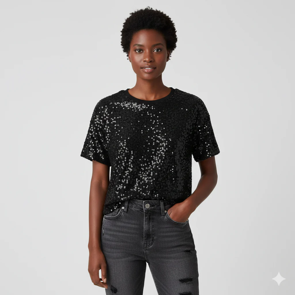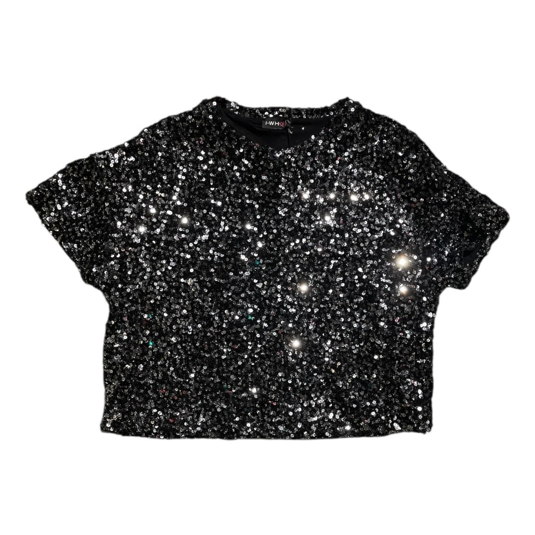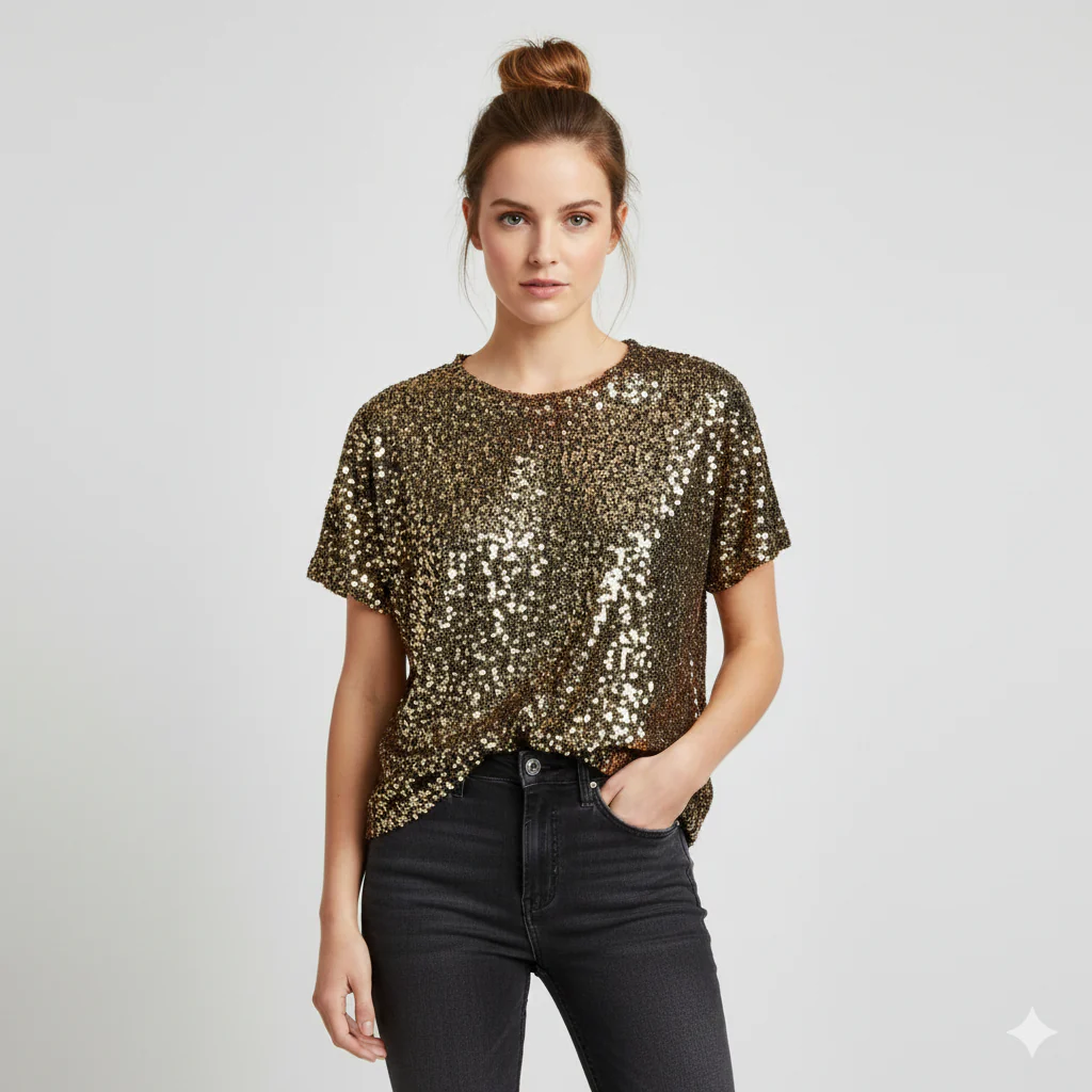 T-shirt donna modello over interamente rivestita di paillettes. Girocollo regolare, vestibilità a scatoletta. Tessuto garzato esterno, interno in maglina elasticizzata. Lunghezza alla vita, fondo stondato arricciato. Veste fino alla L. Composizione fodera 95% viscosa, 5% elastan, esterno 95% poliestere 5% elastan.