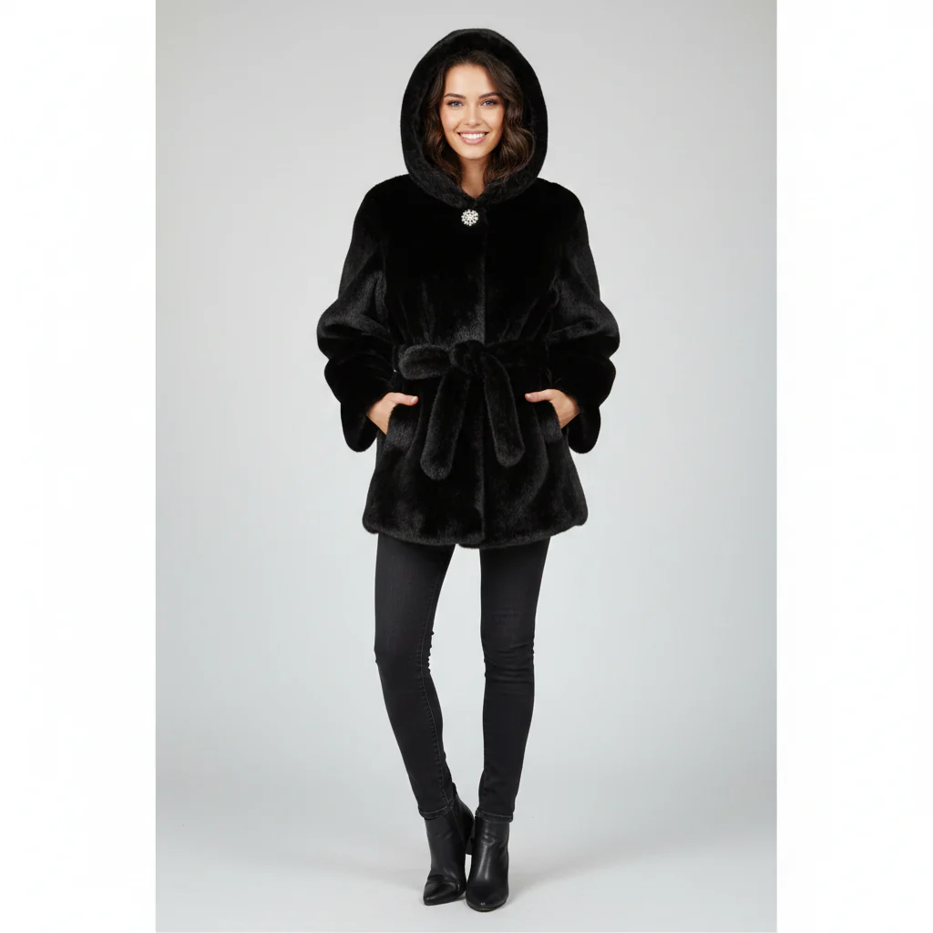 Pelliccia ecologica in tessuto ultra soft. Ampio cappuccio, chiusura al collo con bottone gioiello e bottoni a scomparsa interni, cintura in vita. Tasche laterali, capo foderato. Veste dalla XS ampia alla M.