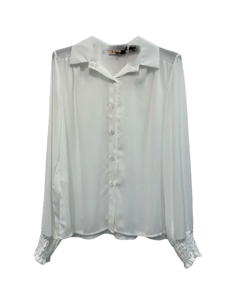 Camicia tessuto georgette leggero. Colletto piccolo, chiusura centrale con bottoni in tinta. Maniche lunghe con polsini smock. Vestibilità regolare.