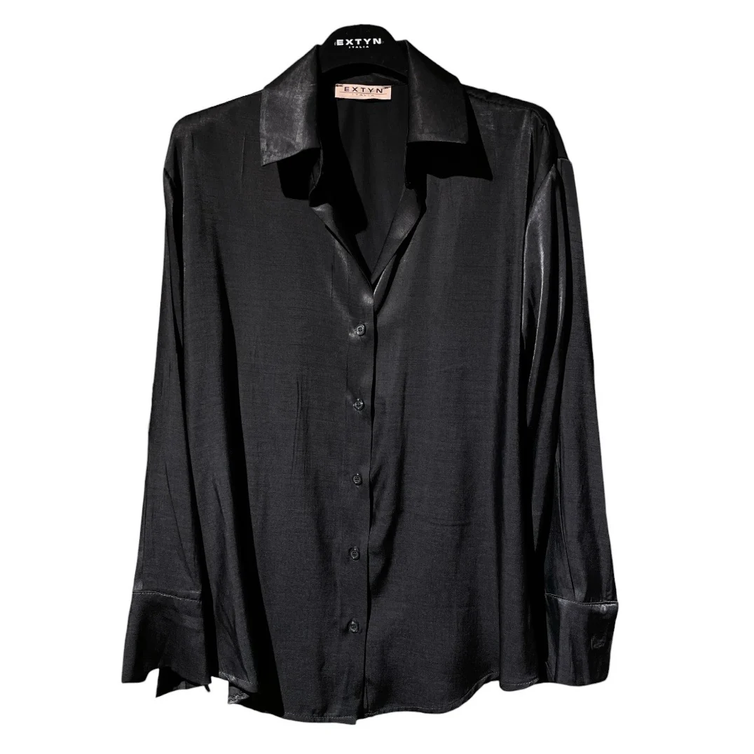 Camicia donna in tessuto cupro misto viscosa. Colletto piccolo, scollo a punta. Chiusura con bottoni in tinta. Vestibilità ampia oversize. Abbinala al vestito per un look particolare. Composizione tessuto 54% poliestere 46% viscosa.
