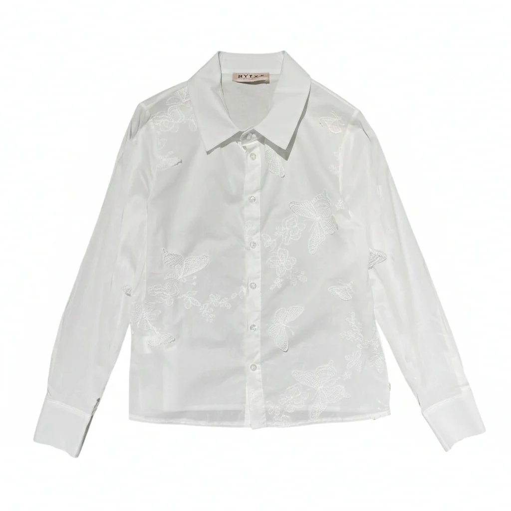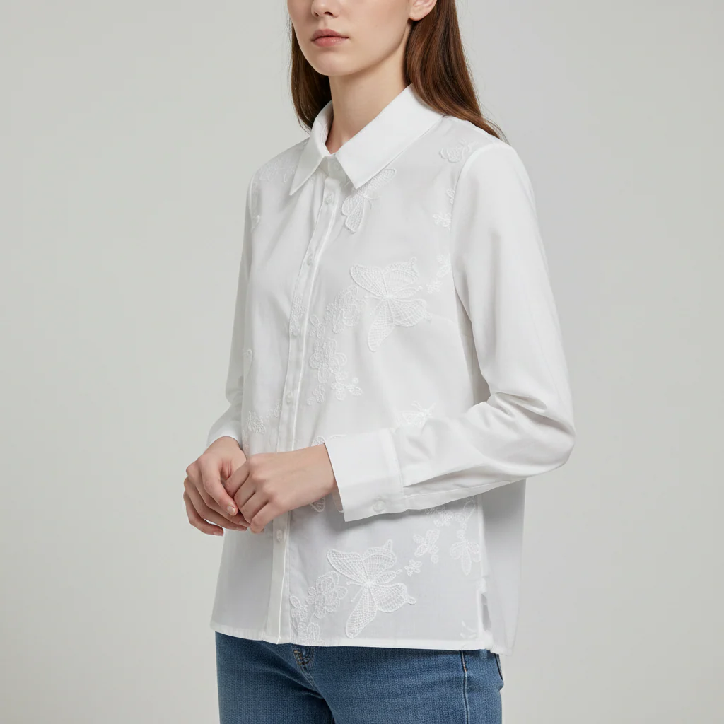 Camicia donna in cotone elasticizzato con applicazioni. Colletto piccolo, chiusura con bottoni in tinta. Farfalle in pizzo di varie dimensioni applicate sul davanti. Vestibilità slim. Composizione T1(corpo) 95% cotone 5% elastico, T2 (dettagli) 70% cotone 30% poliestere.