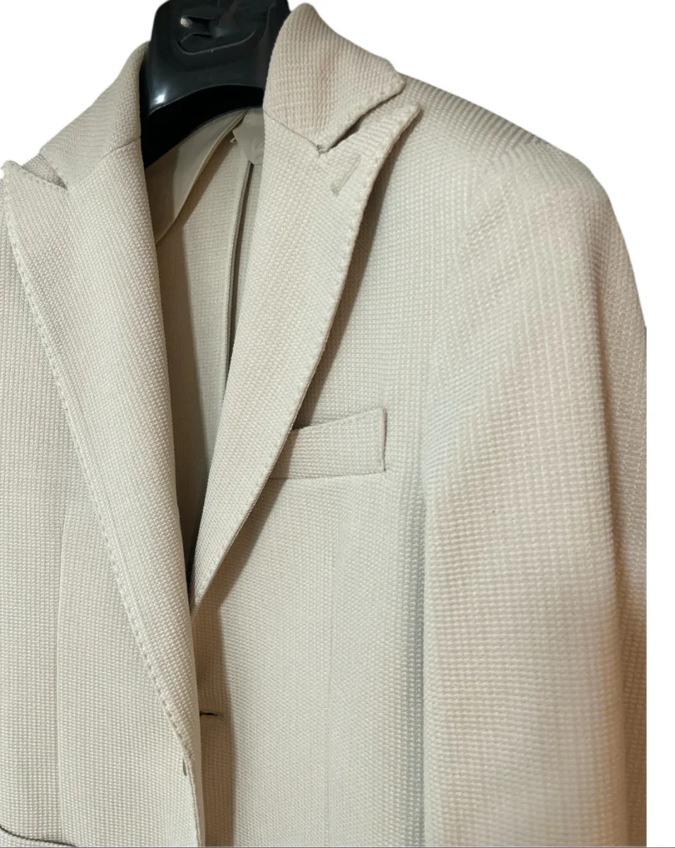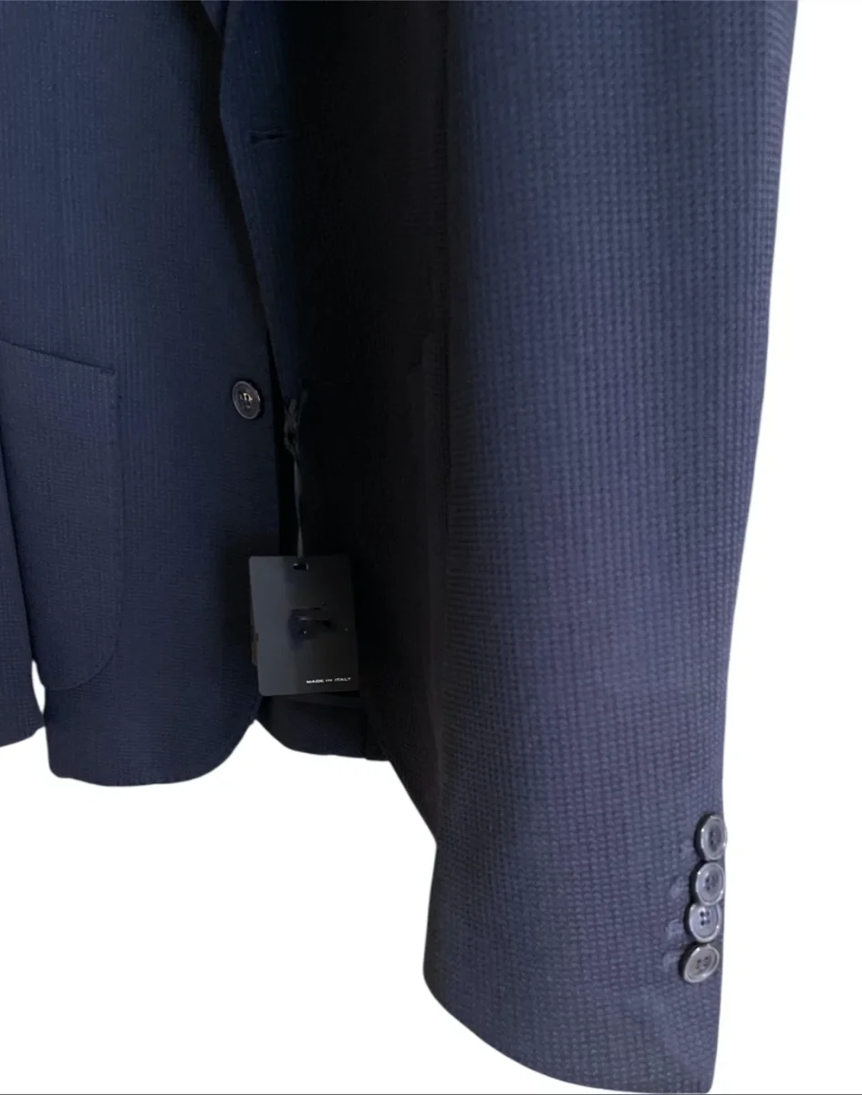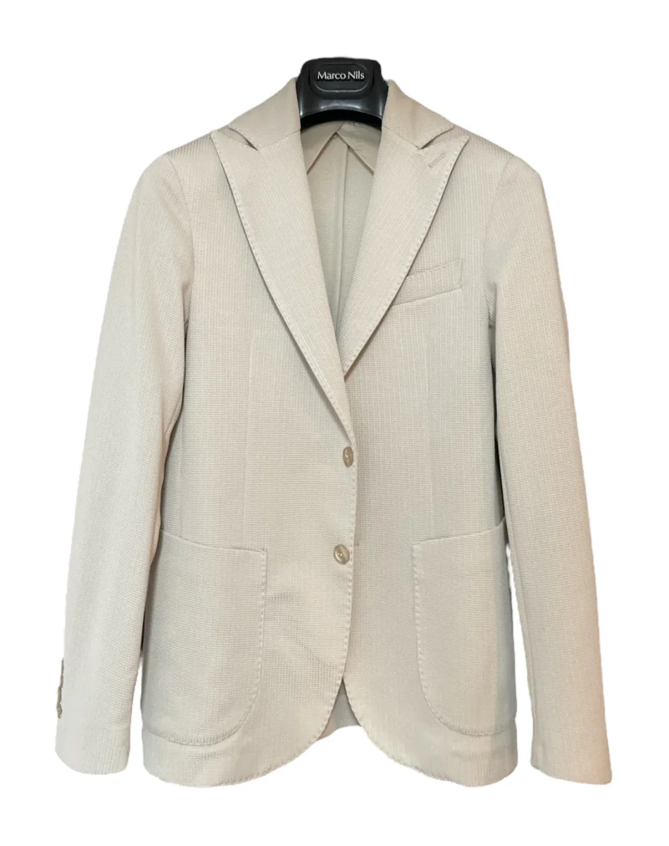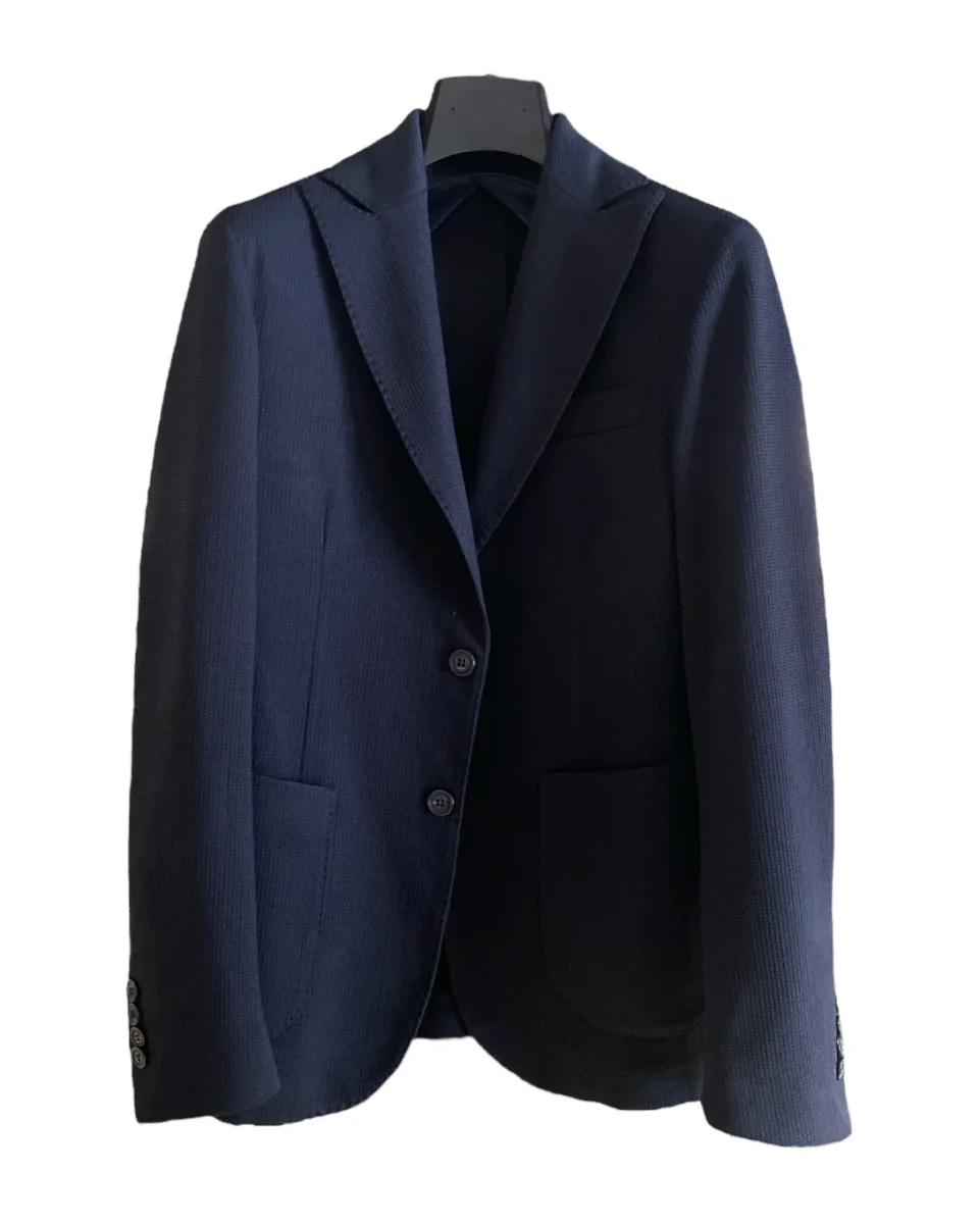Giacca uomo sfoderata in tessuto elasticizzato lavorato a nido d’ape. Collo con revers a lancia, tasche a toppa. Vestibilità slim. Composizione tessuto 80% poliestere 13% viscosa 7% elastan.