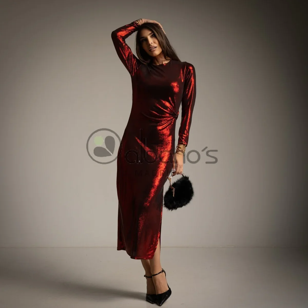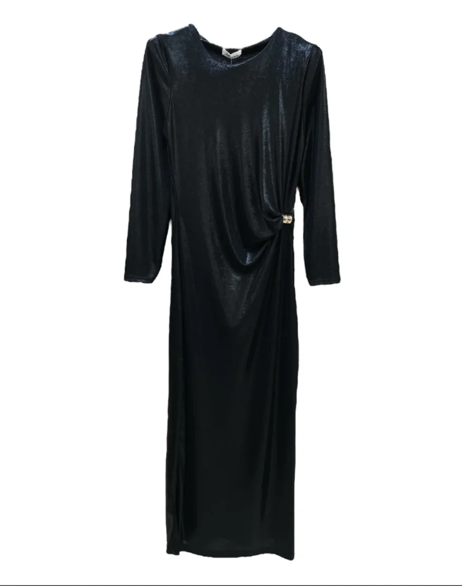 Vestito lungo al polpaccio in tessuto elasticizzato effetto lucido spalmato. Girocollo, maniche lunghe. Dettaglio drappeggiato sul fianco con applicazione oro. Taglia unica, vestibilità aderente.