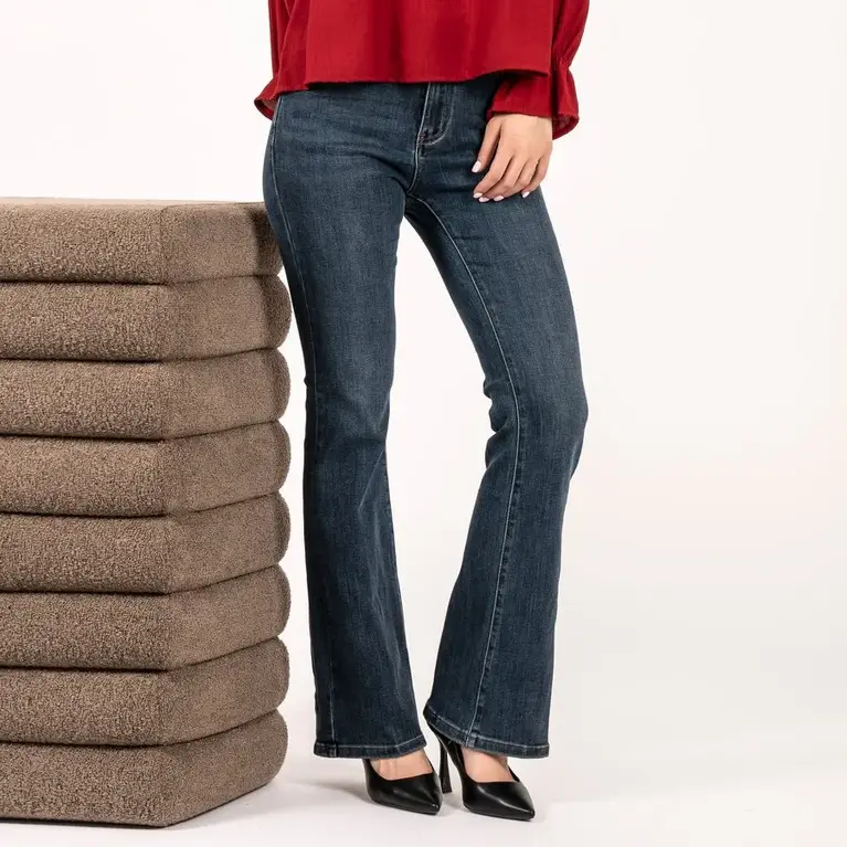 Jeans donna modello a zampa in denim di cotone elasticizzato. Vita regolare, 5 tasche, chiusura con zip e bottone. Gamba aderente fino al ginocchio e fondo a zampetta. Taglia in foto S. Composizione tessuto 61% cotone 34% poliestere 3% viscosa 2% elastan.