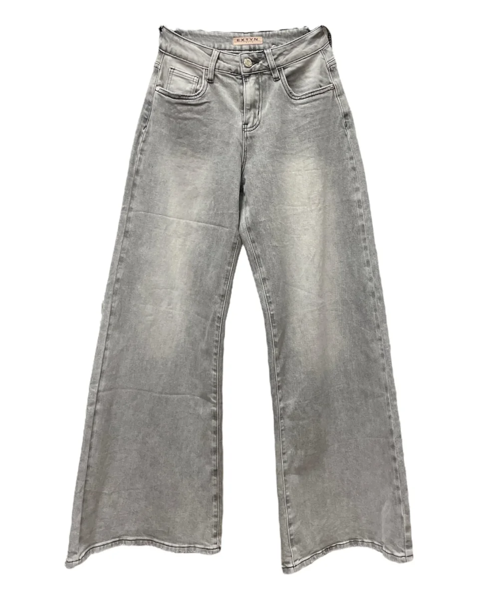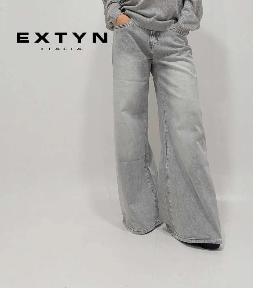 Jeans donna in tessuto denim di cotone elasticizzato. Vita medio/alta, 5 tasche, chiusura con zip e bottone. Gamba e fondo molto ampi, modello palazzo. Vestibilità regolare.
