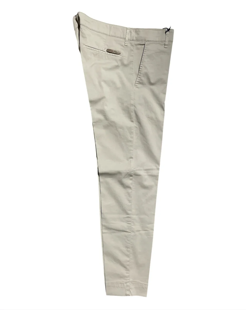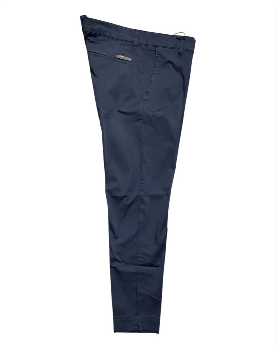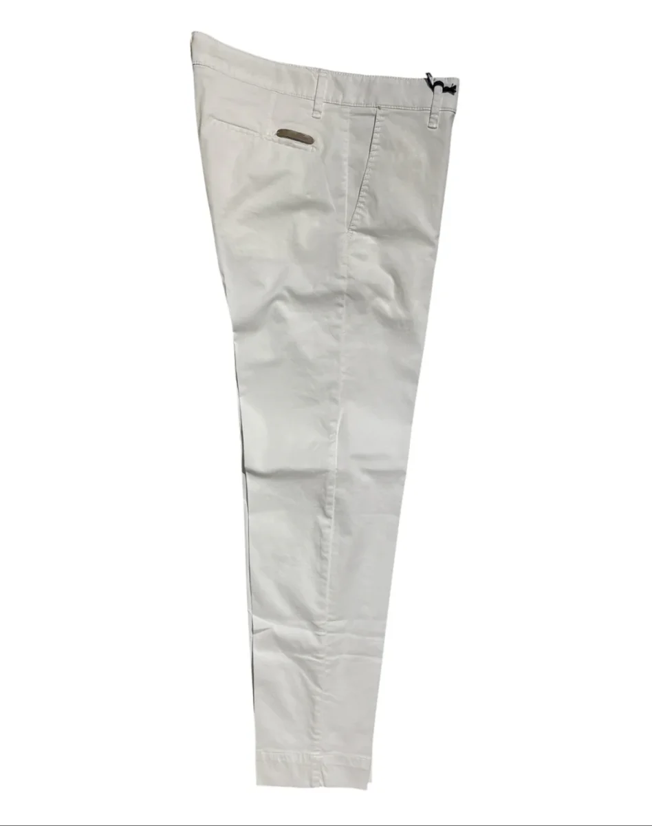 Pantalone basic in tessuto raso di cotone. Vita regolare, chiusura con bottone e zip. Tasche a filo laterali con bordo impunturato, interno del cinturino rifinito in cotone lavorato. Taschine posteriori con dettaglio cucito. Gamba slim e fondo stretto, lunghezza capri. Composizione tessuto 97% cotone 3% elastan.