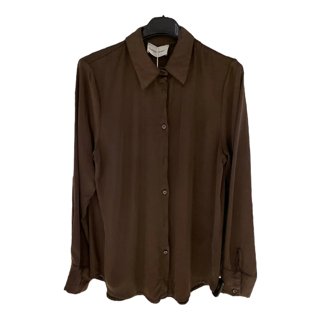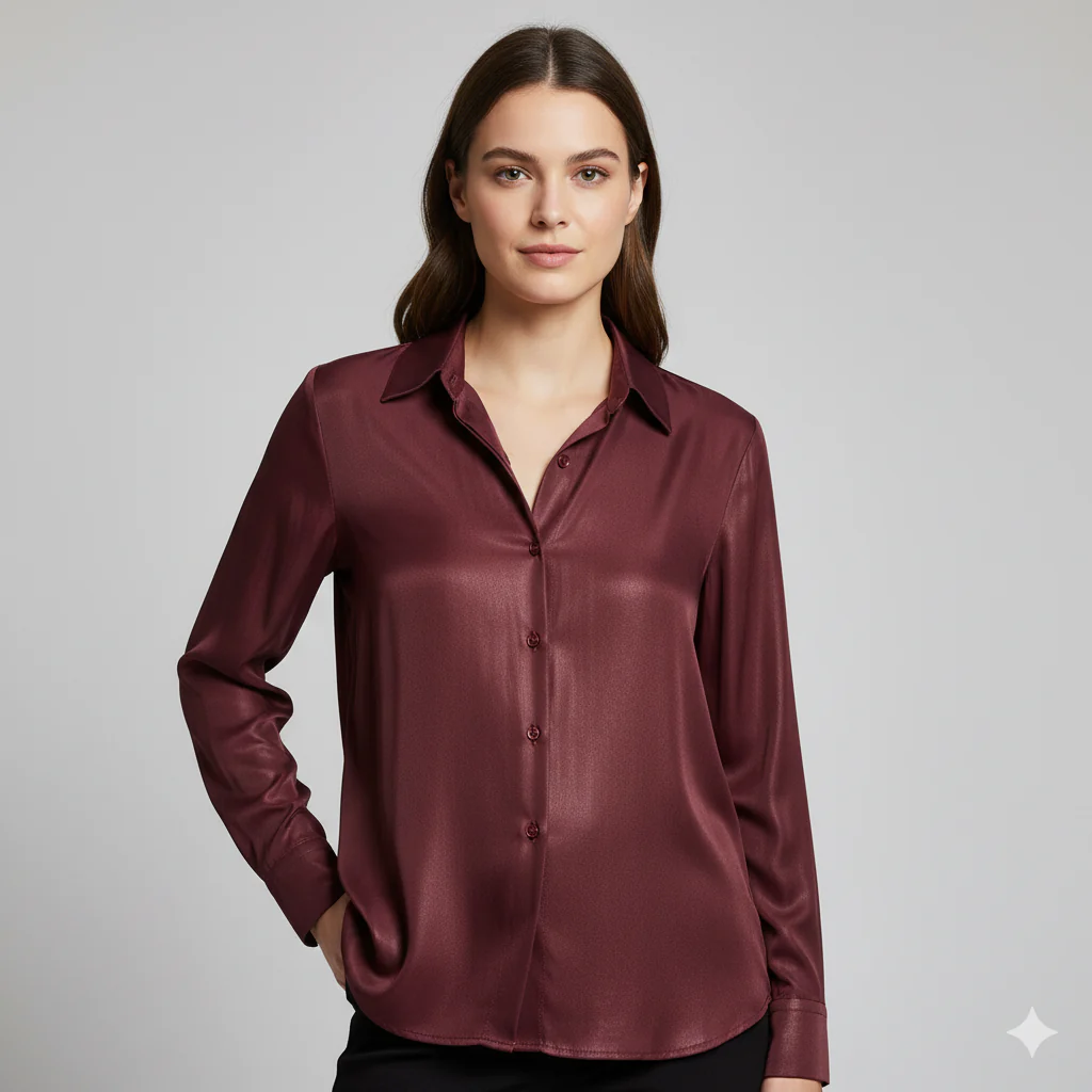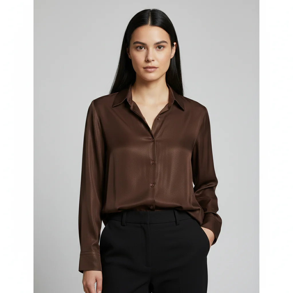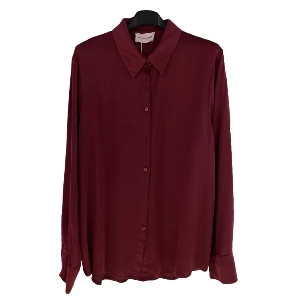 Camicia donna basica in tessuto 100% viscosa mano seta. Colletto piccolo, chiusura con bottoni in tinta. Vestibilità dritta.