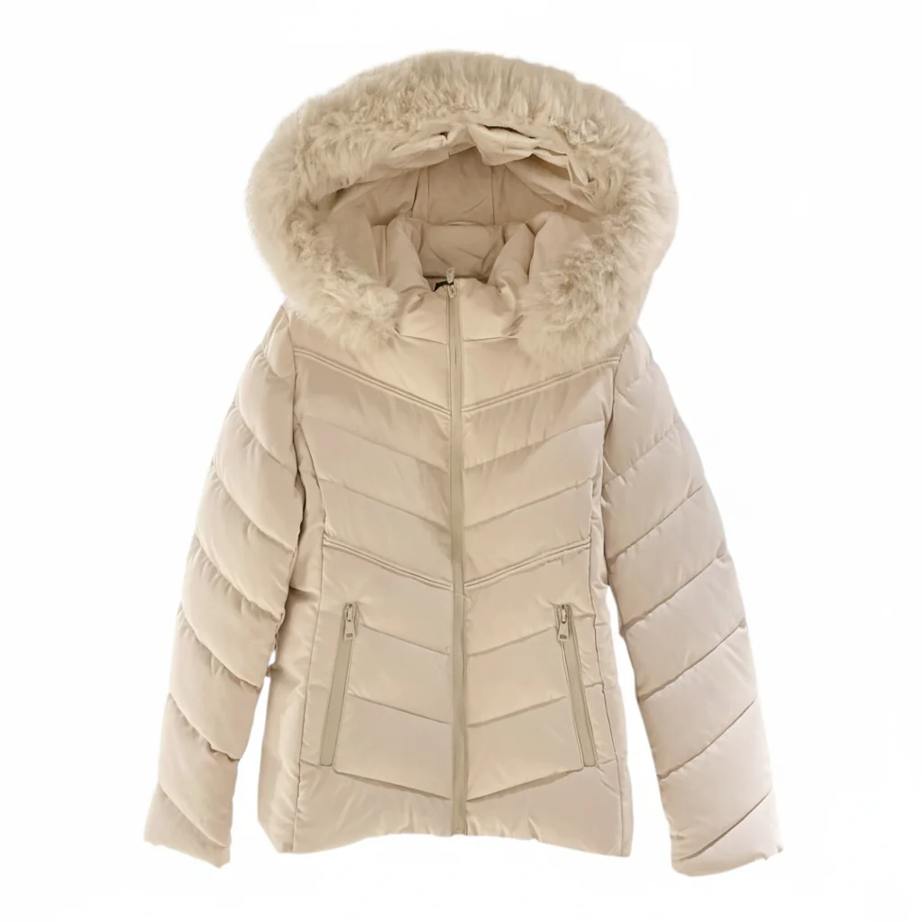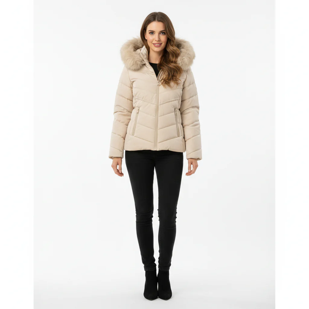 Piumino donna corto in tessuto tecnico effetto mat. Cappuccio con bordo di pelliccia folto. Chiusura con zip centrale in tinta, tessuto lavorato diagonale. Vestibilità sagomata.