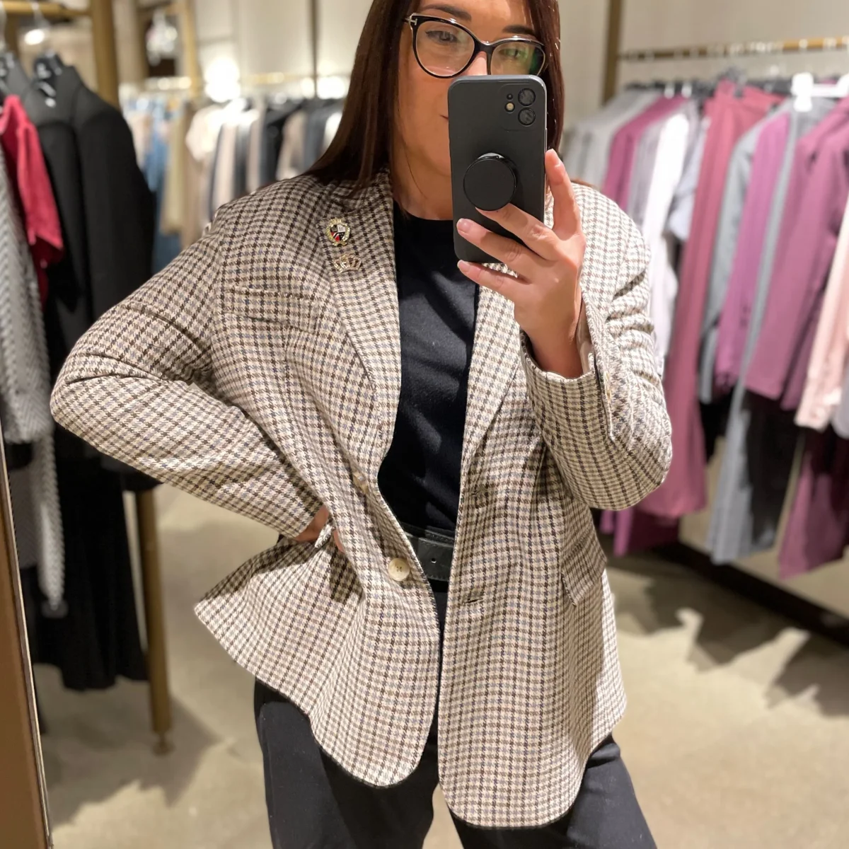Giacca donna oversize in tessuto mano lana. Collo con revers classici, spille stile college applicate. Fantasia pied de poule multicolor. Vestibilità oversize molto ampia. Composizione tessuto 73% poliestere 20% viscosa 7% elastan, fodera 100% poliestere.