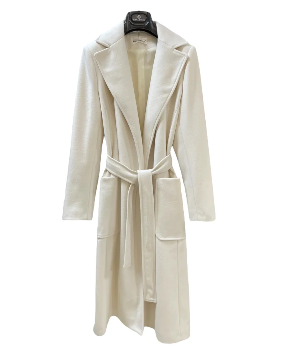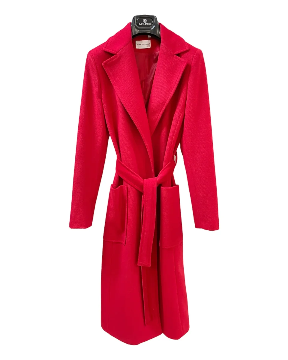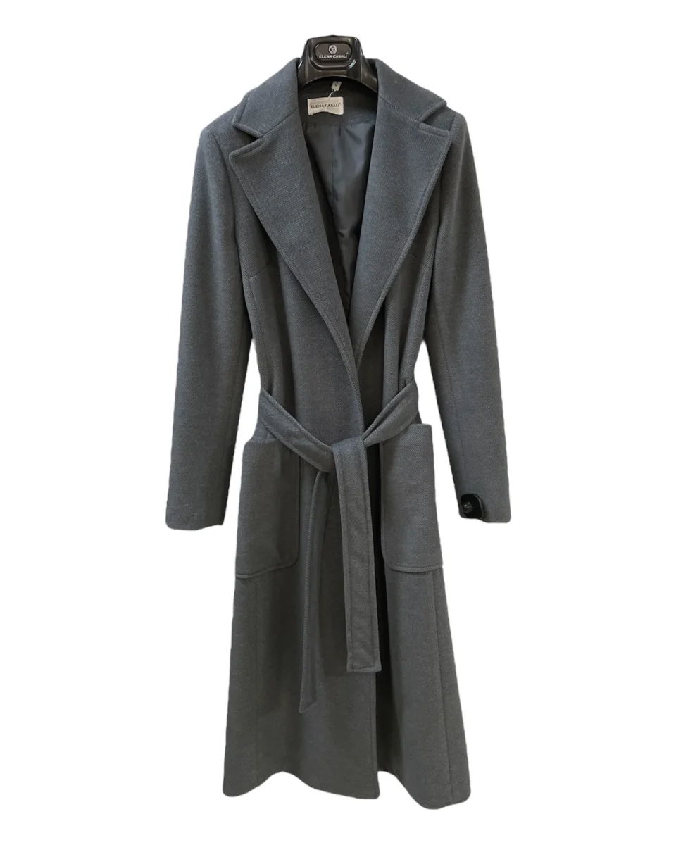 Cappotto lungo modello vestaglia in panno morbido. Collo con revers regolari e collo sciallato, tasche a toppa applicate. Chiusura con cintura centrale. Fodera in tessuto lucido in tinta. Lunghezza sotto al ginocchio. Vestibilità regolare. Composizione tessuto 71% poliestere 24% viscosa 5% elastan.